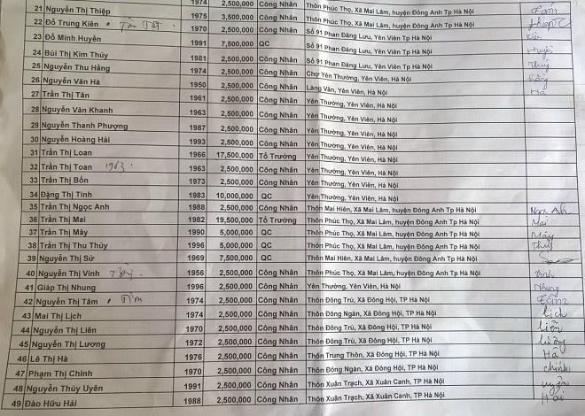 Ba mẹ con bà Chính, bà Hải… chỉ là vài trường hợp trong 50 người dân đã đóng tiền xin việc cho Hợp. Tất cả những người này còn có điểm chung là chưa được trả lại số tiền cọc đã nộp. Người ít nhất 2,5 triệu, người nhiều theo danh sách là bà Khoa (nơi được Hợp thuê làm cơ sở sản xuất tăm bông) hơn 50 triệu.