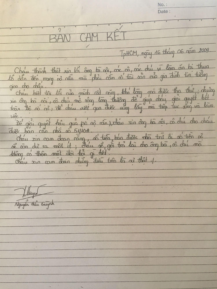 Khi phát hiện nhà bị cầm cố và cháu lừa mình ký vào giấy bán nhà, cụ Đạt họp gia đình, góp tiền chuộc lại sổ đỏ nhà 51/10. Trong buổi họp, Quỳnh thừa nhận có hành vi lừa chú ký giấy, lừa ông bà nội và gia đình. Những lời thừa nhận này được ông Phương ghi âm gửi cơ quan chức năng. Quỳnh còn viết “bản cam kết” vào ngày 19/06/2009, nói rằng: “Vì làm ăn thua lỗ dẫn đến cầm cố tài sản của gia đình tin tưởng giao cho cháu. Cháu xin ông bà nội, cô chú cho cháu bán nhà số 51/10A để trả nợ. Số tiền còn dư cháu sẽ gửi lại cho ông bà, cô chú”. Việc xin bán nhà này không được gia đình cụ Đạt đồng ý.