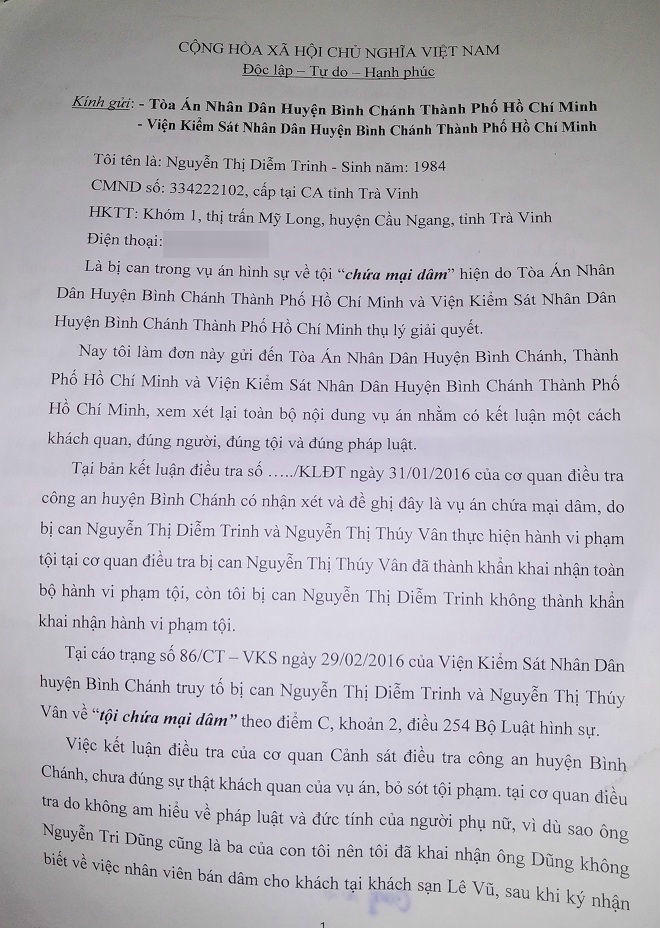 Bị cáo Nguyễn Thị Diễm Trinh (SN 1984, quê Trà Vinh) có đơn cầu cứu trong vụ án “chứa mại dâm” mà chị này được xác định là chủ mưu, đầu vụ. Ngoài ra, vụ án còn có bị cáo thứ hai là Nguyễn Thị Thúy Vân (SN 1980, quê Vĩnh Long). Ngày 18/11, cả hai bị TAND huyện Bình Chánh, TP HCM tuyên phạt 5 năm tù về tội trên.