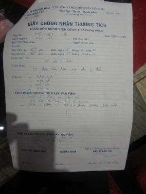 Ngay sau đó, bà Nhiên đưa chồng đi Bệnh viện Quân y 87. Kết quả giám định tại bệnh viện cho biết, ông Mười bị đánh sưng phù nề quai hàm, mặt có nhiều vết thương, bụng và ngực có vết tím bầm. Phần đầu của ông Mười có nhiều vết sưng do bị tác động của ngoại lực. Sự việc được trình báo tới Công an phường Tân Lập ngay sau đó.
