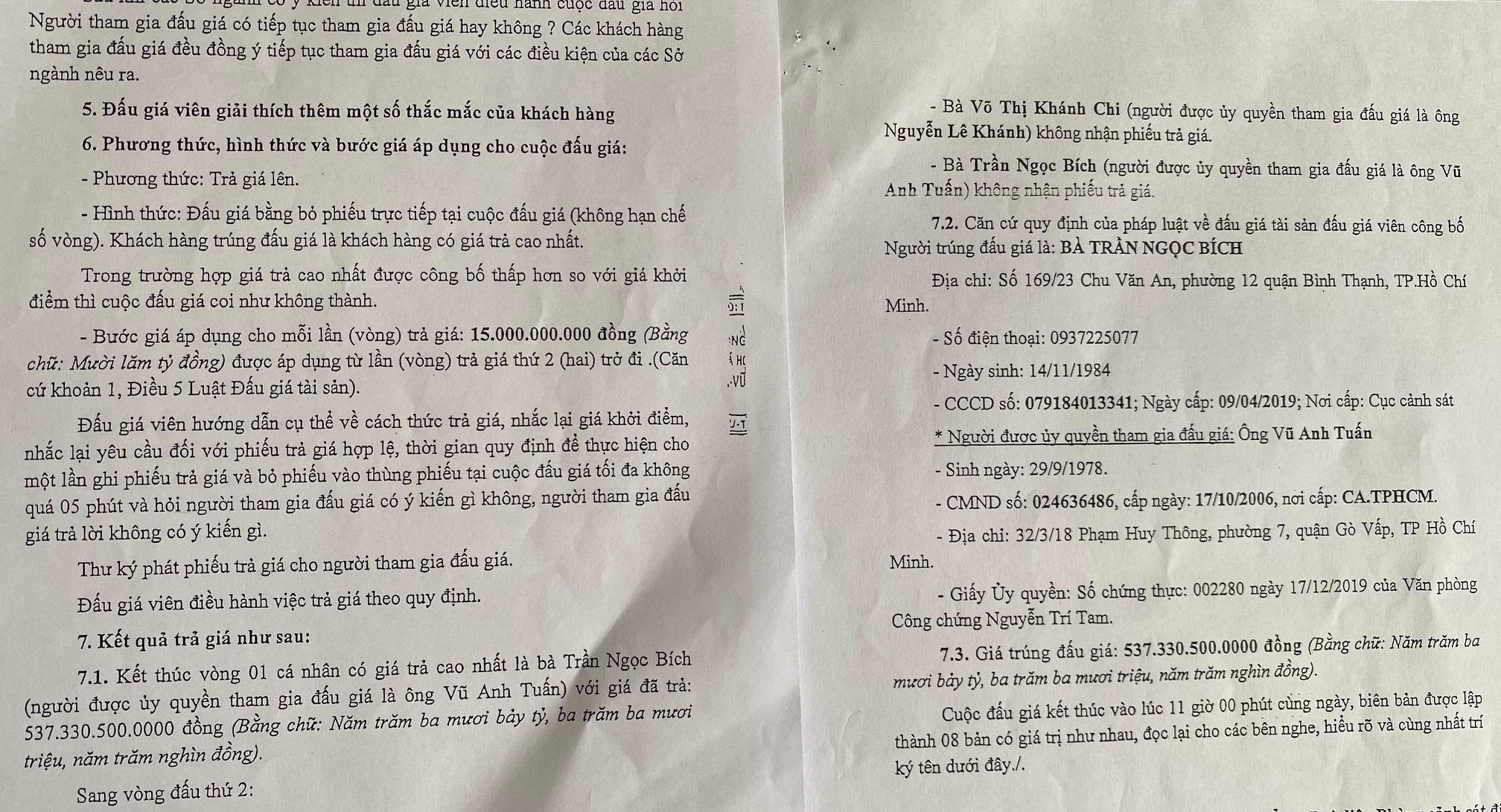 Cuộc đấu giá diễn ra “thần tốc”. Phía bà Chi trả 537,200 tỷ (cao hơn giá khởi điểm 71 triệu), bà Bích trả 537,330 tỷ (cao hơn giá khởi điểm 201 triệu đồng). Rồi cả hai đều từ chối nhận phiếu, không tham gia trả giá tiếp. Cuộc đấu giá kết thúc khi chưa kịp bước vào vòng bước giá. Ông Văn công bố bà Bích trúng đấu giá.