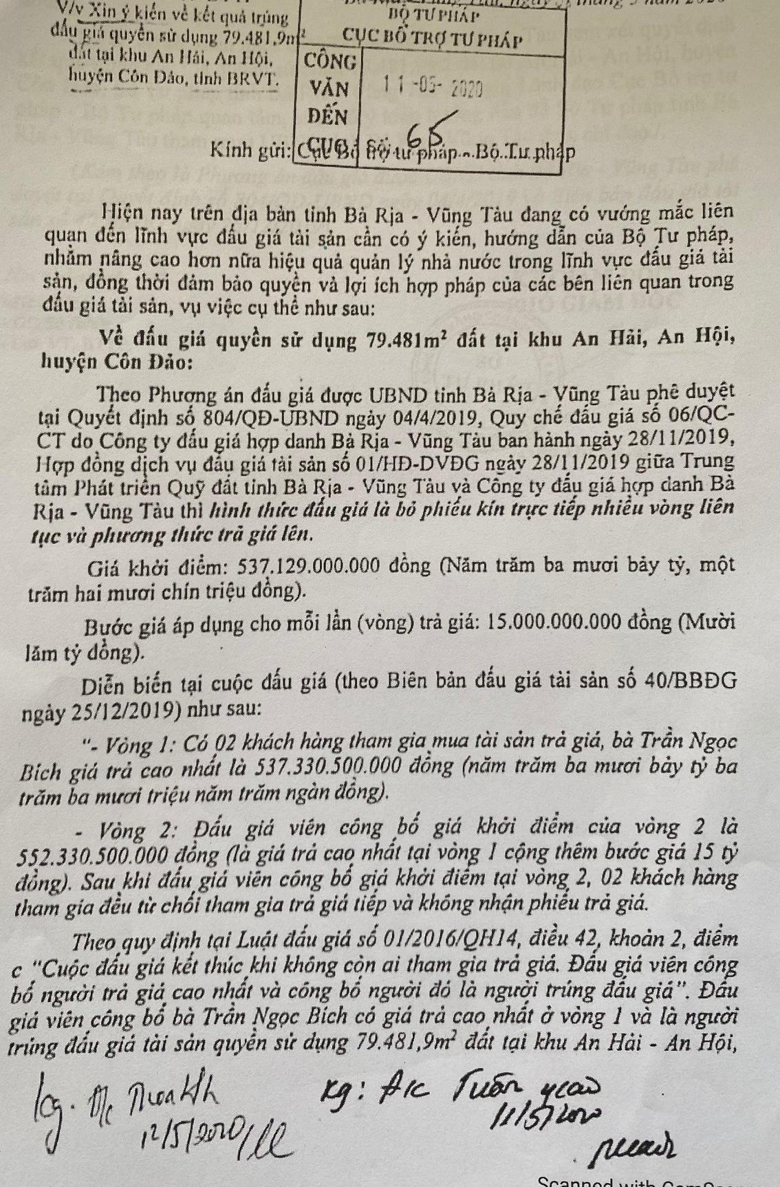 Ngày 8/5/2020, cơ quan chức năng tỉnh có văn bản gửi Cục Bổ trợ tư pháp (Bộ Tư pháp) xin ý kiến. Văn bản này báo cáo chưa đầy đủ, không nêu chuyện “Quy chế” do Cty BR-VT soạn thảo chỉ áp dụng “bước giá” 15 tỷ từ vòng thứ 2 trở đi, không nêu chuyện “Quy chế” ghi “1 tổ chức chỉ được 1 đơn vị tham gia đấu giá”... Trong tài liệu gửi về Bộ, cũng không gửi kèm bản “Quy chế” trên.