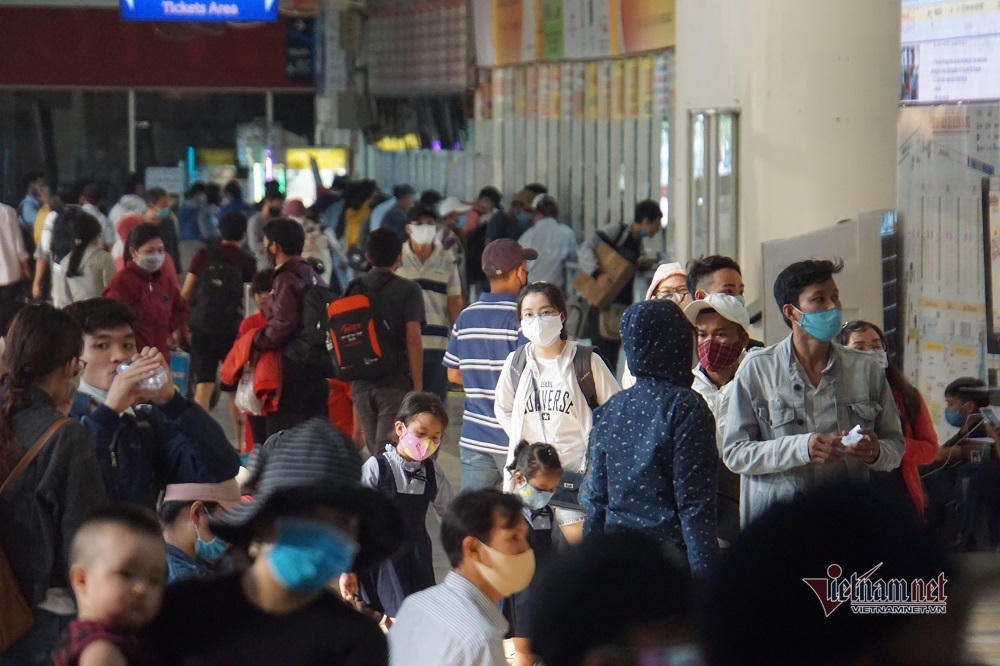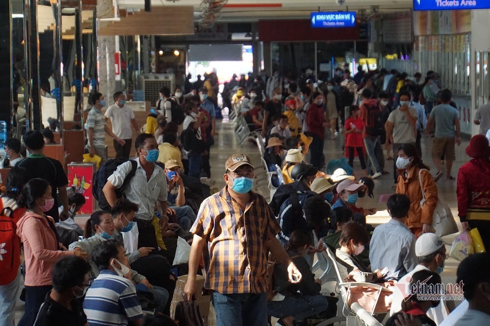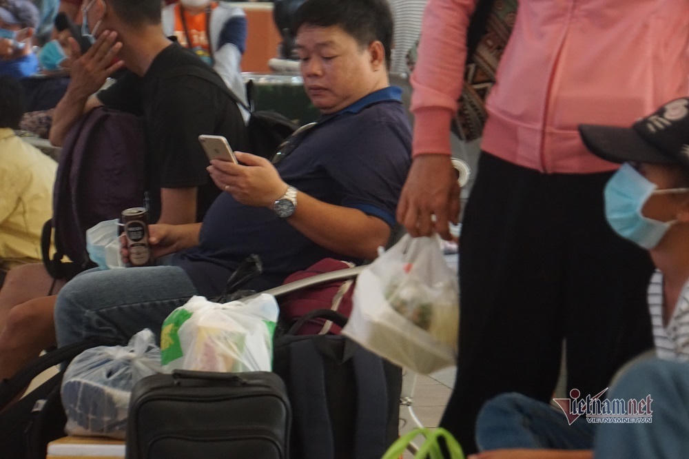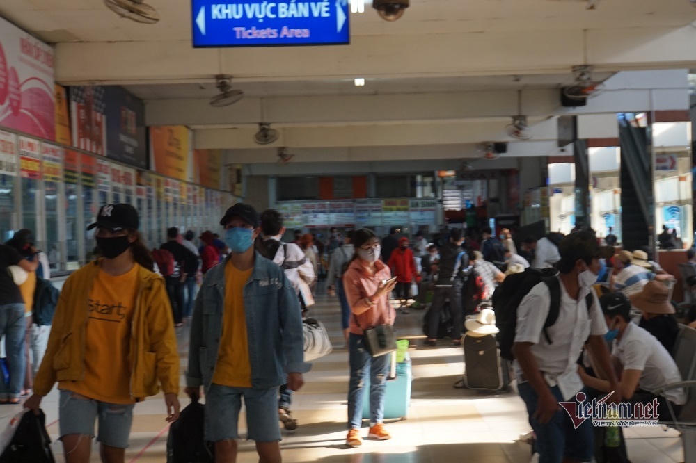 Do đông người cùng dồn ra bến xe chiều cuối cùng trước nghỉ lễ nên xảy ra tình trạng đông đúc, áp sát nhau như những ngày chưa có việc giãn cách xã hội phòng chống dịch Covid-19.