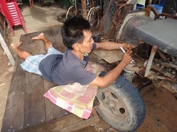 Gần 12h, chiếc xe cải tiến chở anh Thông chỉ lướt qua nhà. Chị hàng xóm thở dài xót xa: “Chắc hôm nay nhiều việc nên chú ấy làm ráng thêm giờ. Chú Thông vất vả lắm, thân mạng tật nhưng vẫn phải cố làm việc để có tiền trang trải cuộc sống gia đình”.