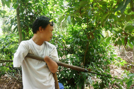 Trước hết, Nguyễn Đình Tuấn dùng đầu tay cụt dài 10cm kẹp cán dao vào nách, dùng khủy tay dài 30cm giữ thân dao, sau đó lấy đà quật con dao vào cành cây rất mạnh và chính xác. Những cành vải to bằng bắp tay người lớn cứ đổ xuống rào rào trước sự ngỡ ngàng của chúng tôi.
