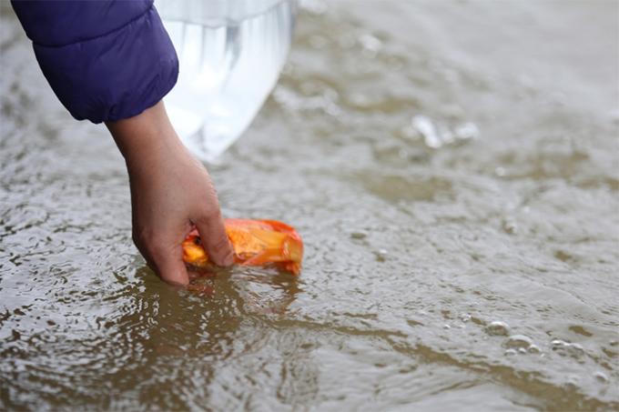 Thả cá chép xuống sông sau lễ cúng để ông Táo lấy "phương tiện" lên trời báo cáo. Người dân thường thả cá ở sông vì sông sẽ chảy ra biển lớn; còn ao, hồ là chỗ nước đọng ít được chọn hơn. Ảnh: Gia Chính