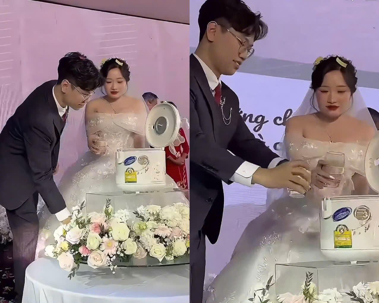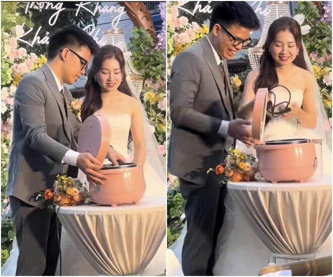 Trước đó vào cuối năm 2024, cư dân mạng cũng chia sẻ đoạn video tương tự ghi lại cảnh cô dâu, chú rể mang nồi cơm điện và gạo lên sân khấu, thực hiện màn nấu cơm độc đáo trong ngày trọng đại tại một nhà hàng ở Tây Hồ (Hà Nội).