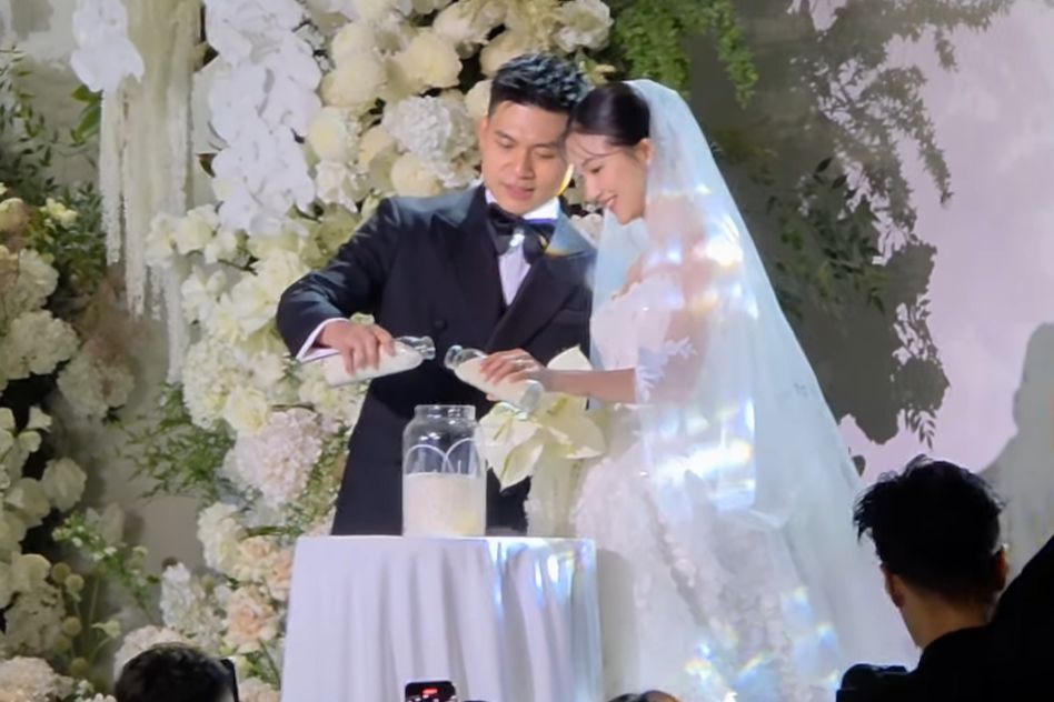 Nghi thức rót gạo hợp hôn của cặp đôi nổi tiếng trên mạng xã hội Hải Long - Salim. |