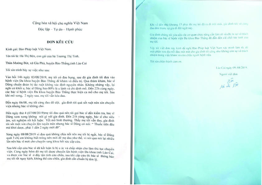 (PLVN) - Vừa qua, Báo Pháp luật Việt Nam nhận được đơn kêu cứu của chị Hà Thị Bên (ở xã Gia Phú, huyện Bảo Thắng, tỉnh Lào Cai) về việc mẹ chị là bà Trương Thị Tỉnh tử vong sau 5 ngày điều trị tại Bệnh viện Đa khoa Bảo Thắng. Gia đình nạn nhân cho rằng sự tắc trách của y bác sĩ trong chẩn đoán và điều trị đã khiến người nhà họ tử vong oan uổng...