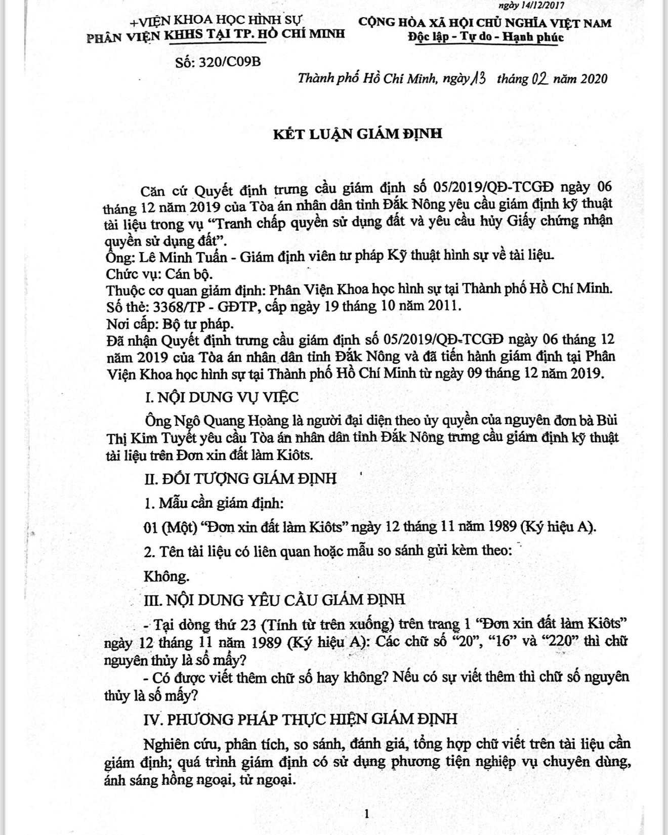 Phía nguyên đơn cũng cho rằng trong quá trình xin cấp sổ đỏ vào năm 2001, bị đơn đã có hành vi chỉnh sửa một số giấy tờ để UBND TP Gia Nghĩa cấp sổ đỏ cho mình. Đơn cử như “Đơn xin đất làm ki-ốt” ghi lập năm 1989 đã bị chỉnh sửa nhiều con số và đã được kết luận bị chỉnh sửa trong các Kết luận giám định 201/GĐTL-PC09 ngày 18/11/2019, 226/KL-KTHS ngày 9/9/2022 của Phòng Kỹ thuật hình sự Công an tỉnh Đắk Nông, 320/C09B ngày 13/2/2020 của Phân Viện Khoa học hình sự tại TP HCM.