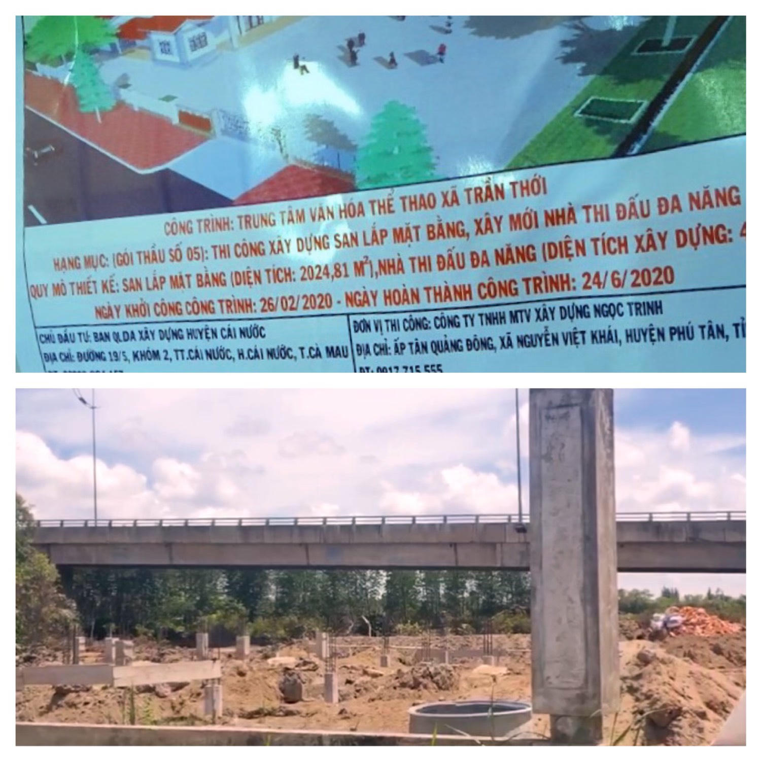 Phía trước công trình (đối diện trụ sở UBND xã Trần Thới), nhà thầu Công ty TNHH MTV xây dựng Ngọc Trinh cũng treo bảng thông tin về ngày khởi công là 26/2/2020, ngày hoàn thành là 24/6/2020. Như vậy, chỉ mới sau 6 ngày thông báo kết quả lựa chọn nhà thầu gói thầu số 5, Ban QLDA xây dựng huyện Cái Nước đã ký hợp đồng với Công ty TNHH MTV xây dựng Ngọc Trinh và cho triển khai thi công công trình.