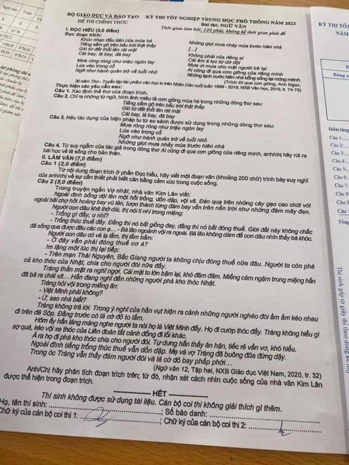 Tuy nhiên, gần 9h, mạng xã hội đã xuất hiện hình ảnh đề thi môn Ngữ văn trong kỳ thi tốt nghiệp THPT 2023.