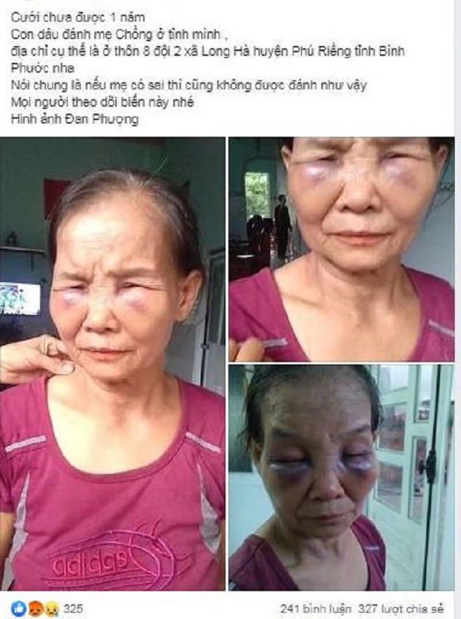 Trên mạng xã hội xuất hiện hình ảnh một người phụ nữ lớn tuổi với đôi mắt bầm tím với dòng chia sẻ: Mới chưa được 1 năm, con dâu đánh mẹ chồng và kèm theo địa chỉ cụ thể.
