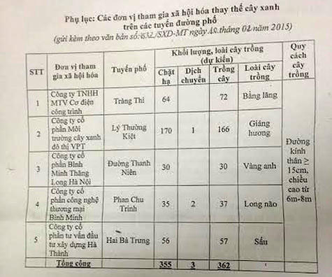 Và trong Công văn số 1532/SXD-MT do ông Phó Giám đốc Sở Xây dựng Hoàng Nam Sơn ký (vào ngày 10/2/2015) cho biết: “Giao Công ty TNHH MTV Cơ điện công trình, Công ty Cổ phần môi trường cây xanh đô thị - VPT, Công ty cổ phần Bình Minh Thăng Long Hà Nội, Công ty Cổ phần thương mại công nghệ Bình Minh, Công ty Cổ phần tư vấn đầu tư xây dựng Hà Thành thực hiện thay thế các cây xanh không đúng chủng loại cây đô thị, không đảm bảo mỹ quan đô thị, các cây xanh nghiêng, sâu mục trên các tuyến phố Tràng Thi, Lý Thường Kiệt, Hai Bà Trưng, Phan Chu Trinh, đường Thanh Niên bằng nguồn kinh phí xã hội hóa để triển khai thực hiện theo quy định”.