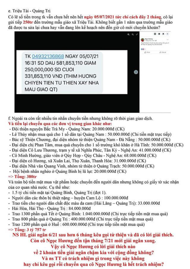 Dân mạng còn đặt nghi vấn mẹ Hồ Ngọc Hà giải ngân tiền từ thiện chậm trễ. Chẳng hạn như ngày 1/11/2020 kê khai ủng hộ MTTQ Quảng Trị 100 triệu nhưng đến ngày 16/11/2020 mới thực hiện giao dịch chuyển tiền. Đến tháng 4/2021 (5 tháng sau lũ) bà mới chuyển tiền cho người dân Ngư Thủy (Quảng Bình) làm đường dây điện, tháng 5/2021 (6 tháng sau lũ) mới chuyển tiền xây cầu cho Bản Ô (Quảng Bình). Đến tháng 7/2021 (8 tháng sau lũ) bà mới chuyển tiền tu sửa trường mẫu giáo ở Triệu Tài (Quảng Trị).