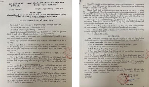 Dù có mức giá dự thầu thực hiện công trình cao hơn và vắng mặt tại buổi mở thầu công khai, nhưng tại Quyết định số 321/QĐ-BQL ngày 02/12/2019 của BQL xã Hồng Hóa về việc phê duyệt kết quả lựa chọn nhà thầu gói thầu nói trên thì đơn vị TTQ Cầu Roòng vẫn… trúng thầu.