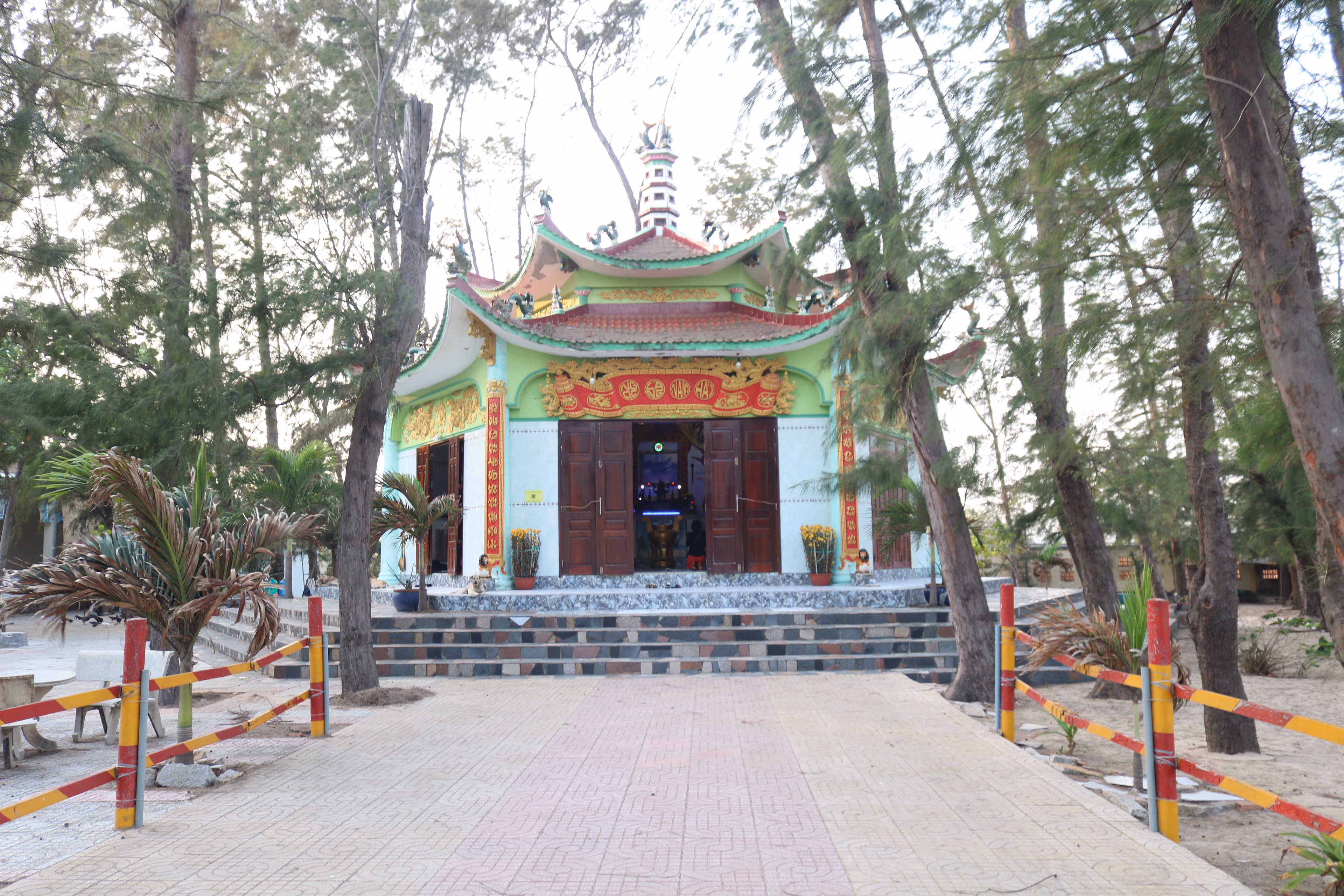 Từ cổng nghĩa địa được xây dựng bằng bê tông cốt thép, người vào viếng sẽ bắt gặp một am thờ Phật Bà Quan Âm Nam Hải đặt ở vị trí trang trọng. Từ đây, con đường thần đạo chạy dọc khu nghĩa địa dẫn thẳng vào ngôi đền hình lục giác, nơi đặt bàn thờ cá Ông. Bên trong nội điện có hai tượng cá voi cùng một bộ xương cá dài khoảng 2 mét, xung quanh là câu đối, hạc chầu, rồng cuốn, tạo nên không gian thờ tự uy nghiêm và đậm chất văn hóa biển.