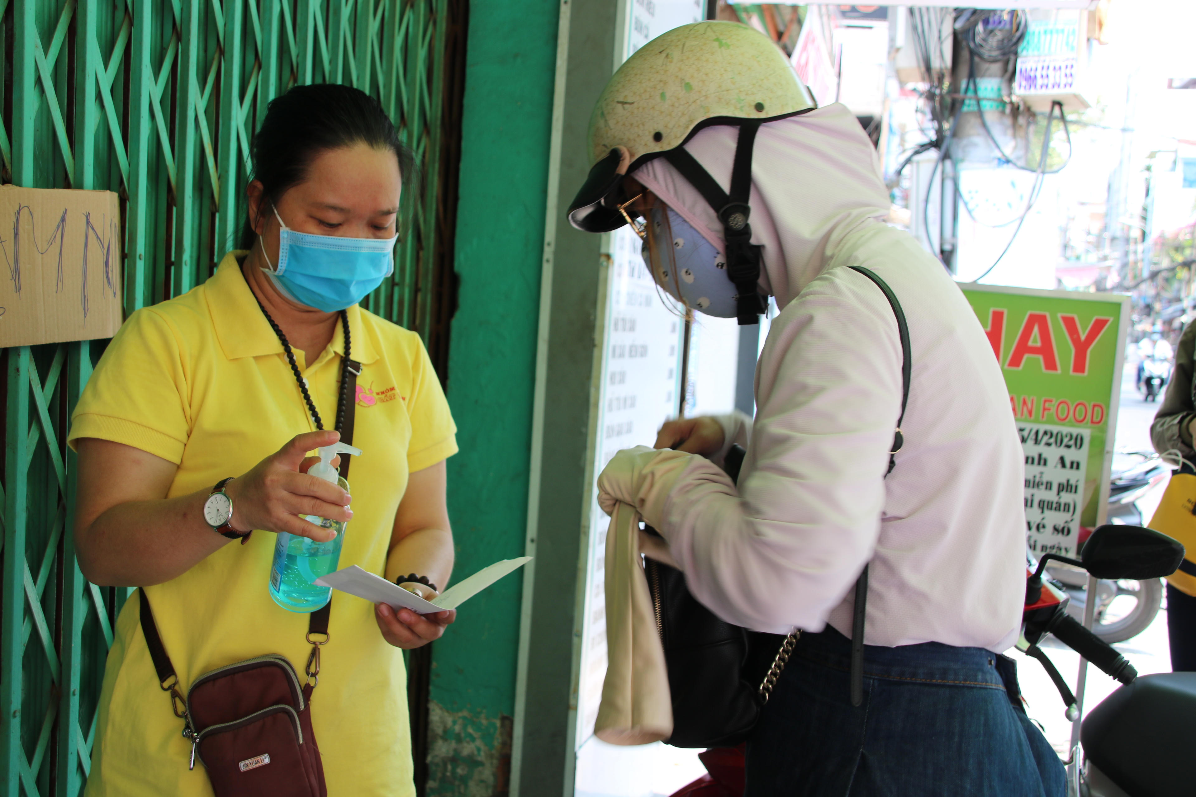 Chị Trần Mộng Phương Thảo, tình nguyện viên đồng hành cùng vợ chồng anh Nhật, chị Ngân vừa nhắc mọi người giữ cự ly tiếp xúc 2m theo đúng quy định, vừa xịt nước rửa tay cho mọi người trước khi trao cơm.