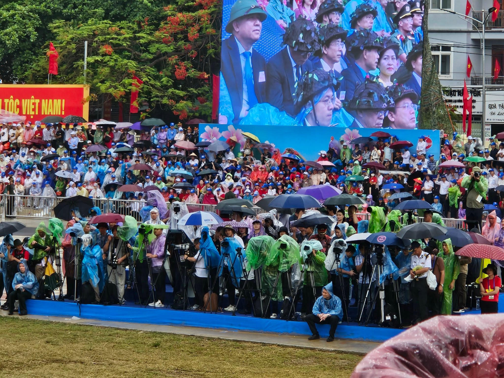 Các phóng viên báo chí tác nghiệp tại Lễ kỷ niệm 70 năm Chiến thắng Điện Biên Phủ trong cơn mưa rào xối xả. |