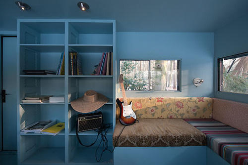 Nội thất bên trong khá đầy đủ với ghế, giường và tủ sách. |