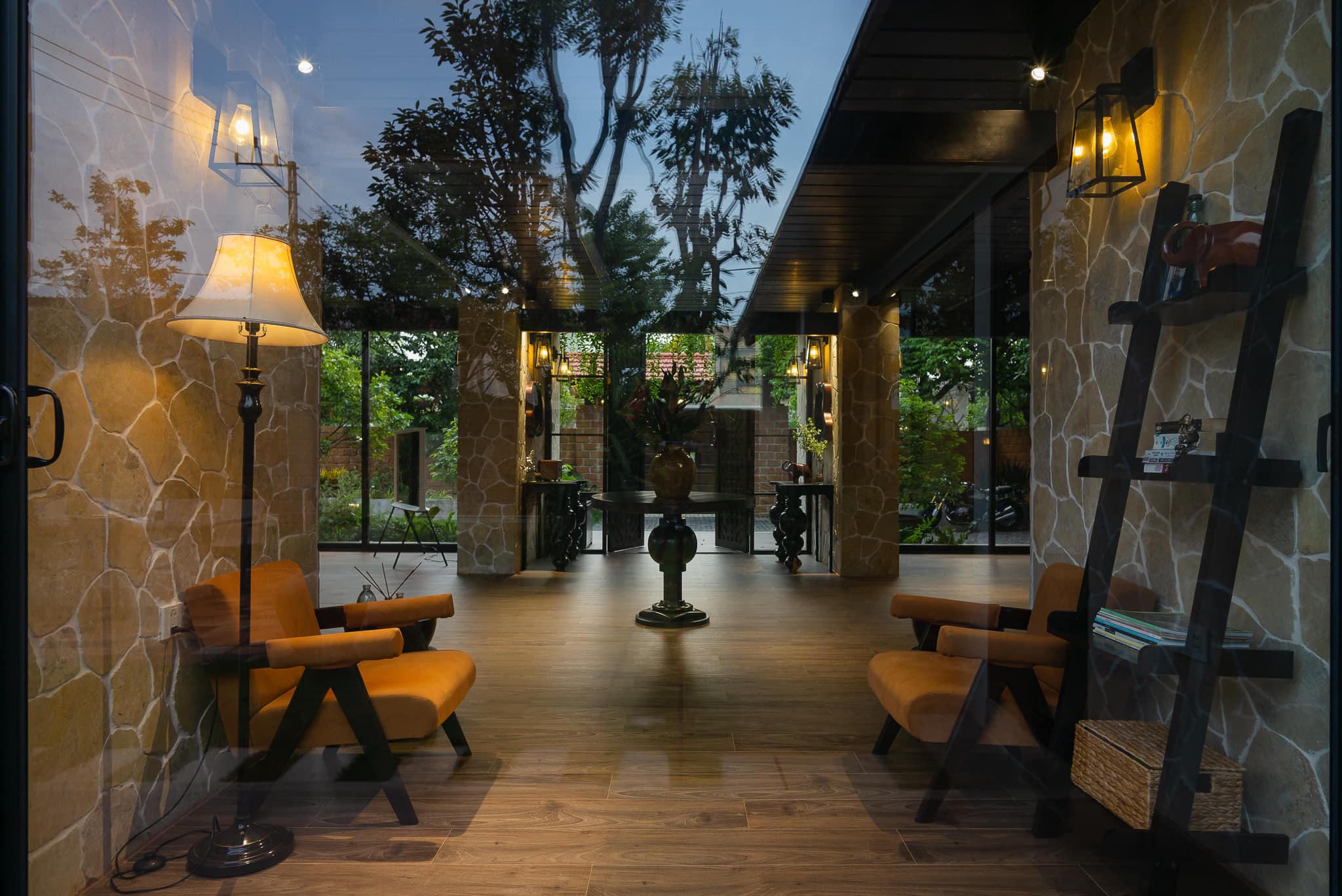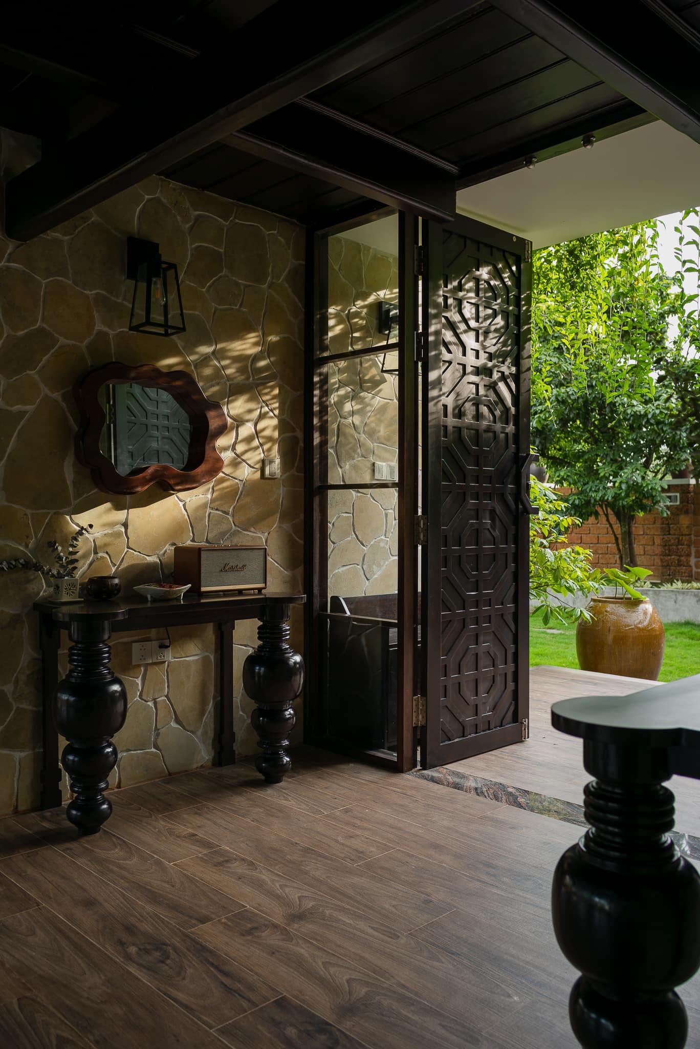 Sự đối lập giữa gam màu đỏ của tường đá ong và không gian xanh khi bước vào nhà. |