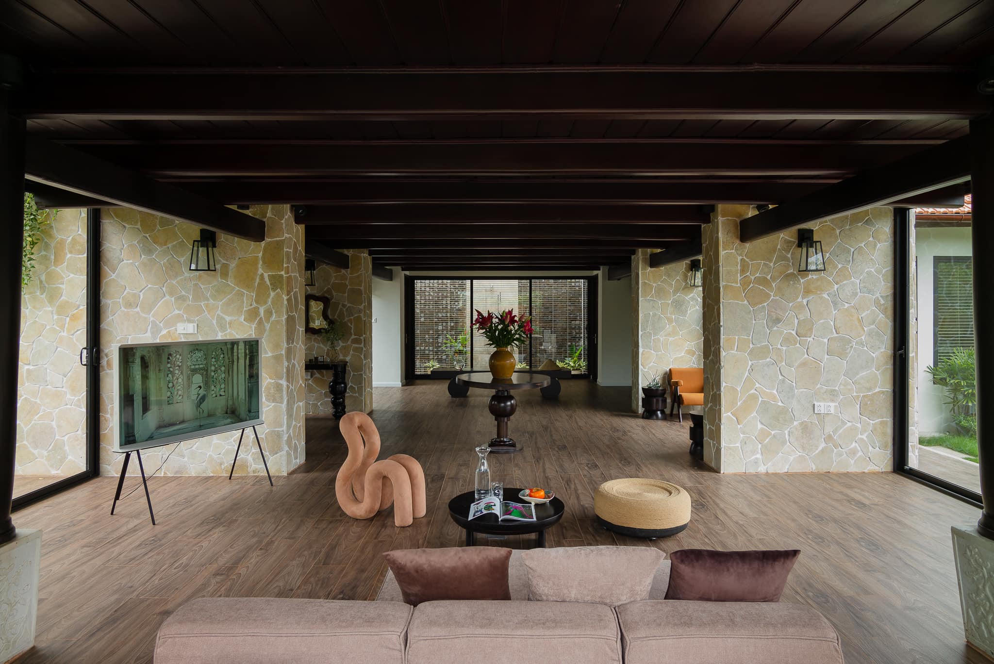 Những mảng tường đá rối tạo điểm nhấn và cân bằng bố cục cho căn phòng. |