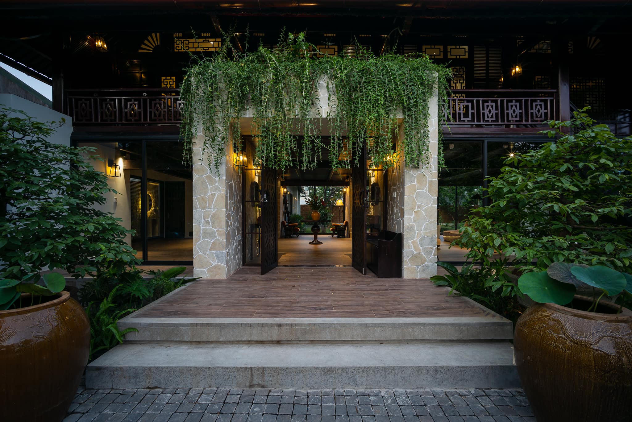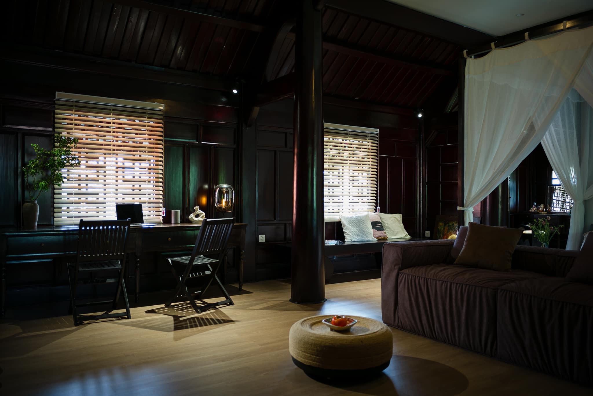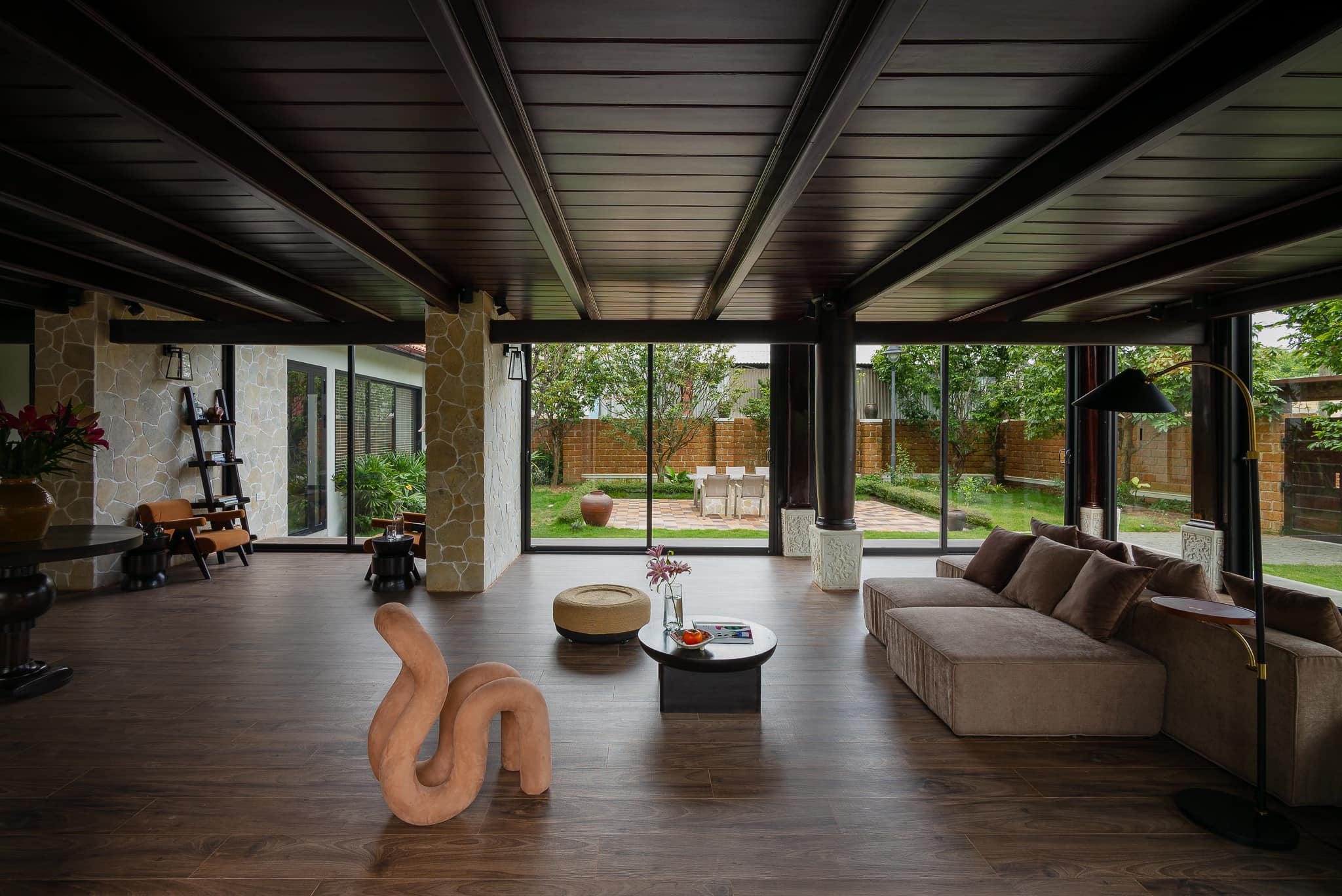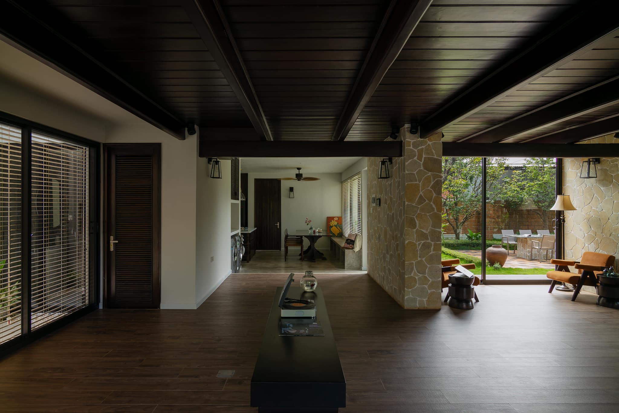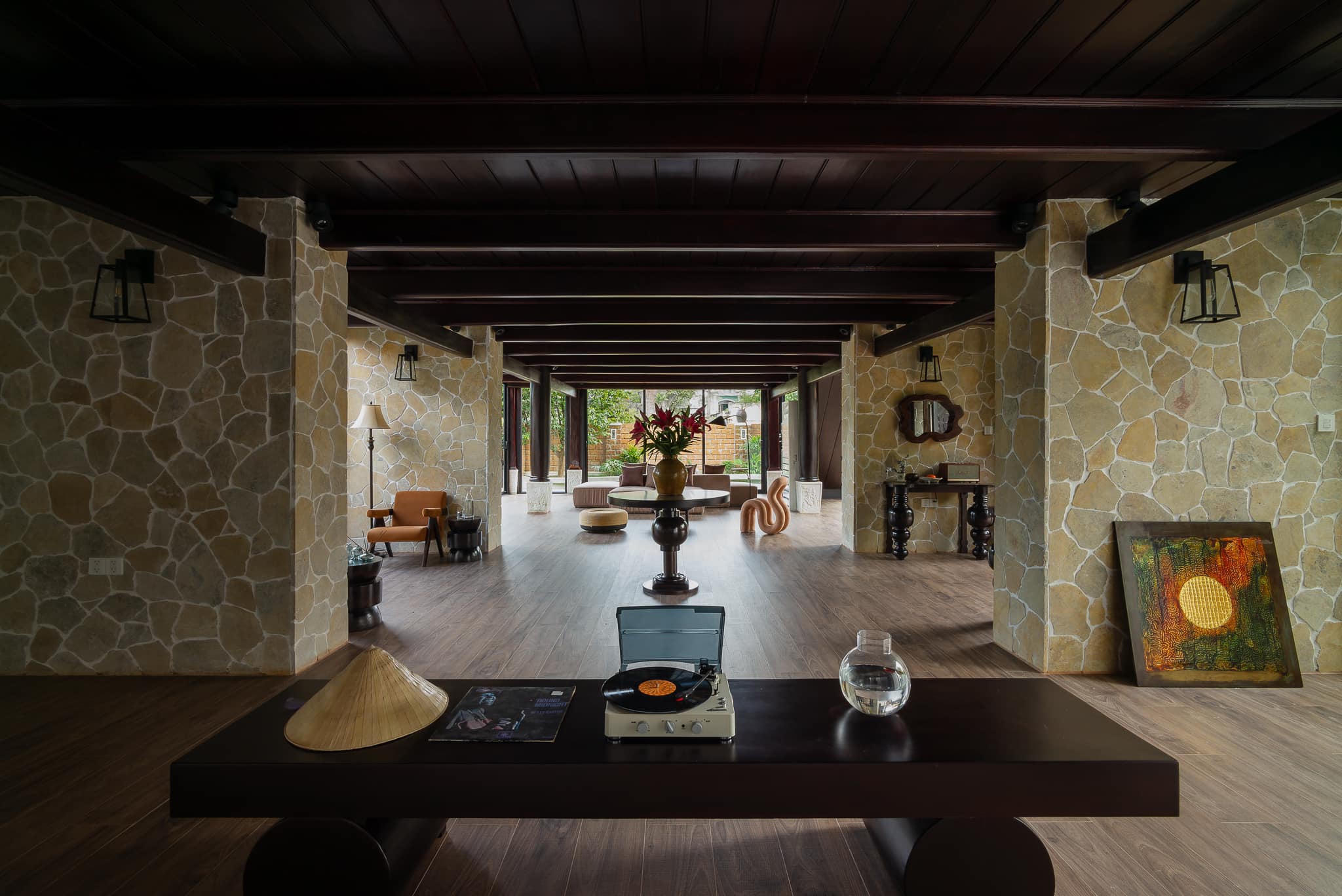 Hiện trạng của nhà sàn là hệ cột dầm gỗ làm bằng những cây gỗ lim nguyên khối chạy đan xen, dễ gây cảm giác rối và rỗng. Anh Thanh cho biết, để thay đổi điều đó, kiến trúc sư đã tư vấn dựng thêm các mảng tường đá để giúp tạo điểm nhấn và cảm giác mạnh về khối, độ đặc rỗng của không gian rõ ràng hơn. Hệ nhôm kính trượt được lắp đặt xung quanh phần nhà dưới để tránh gió bão nhưng vẫn giữ được không gian mở và tầm nhìn rộng.