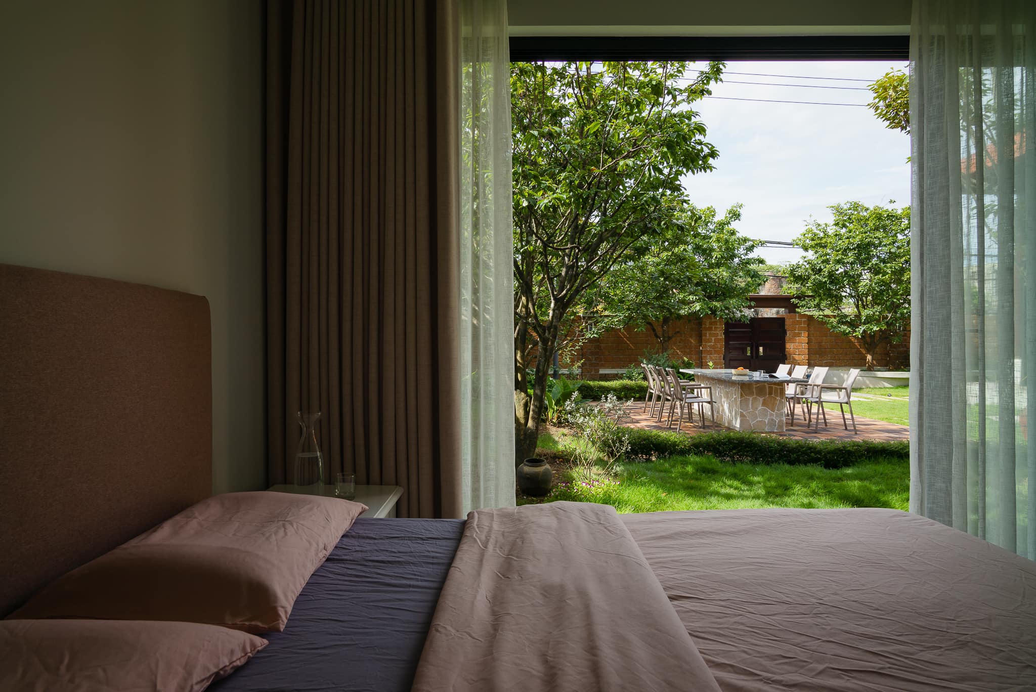 Phòng ngủ nhìn ra vườn. |