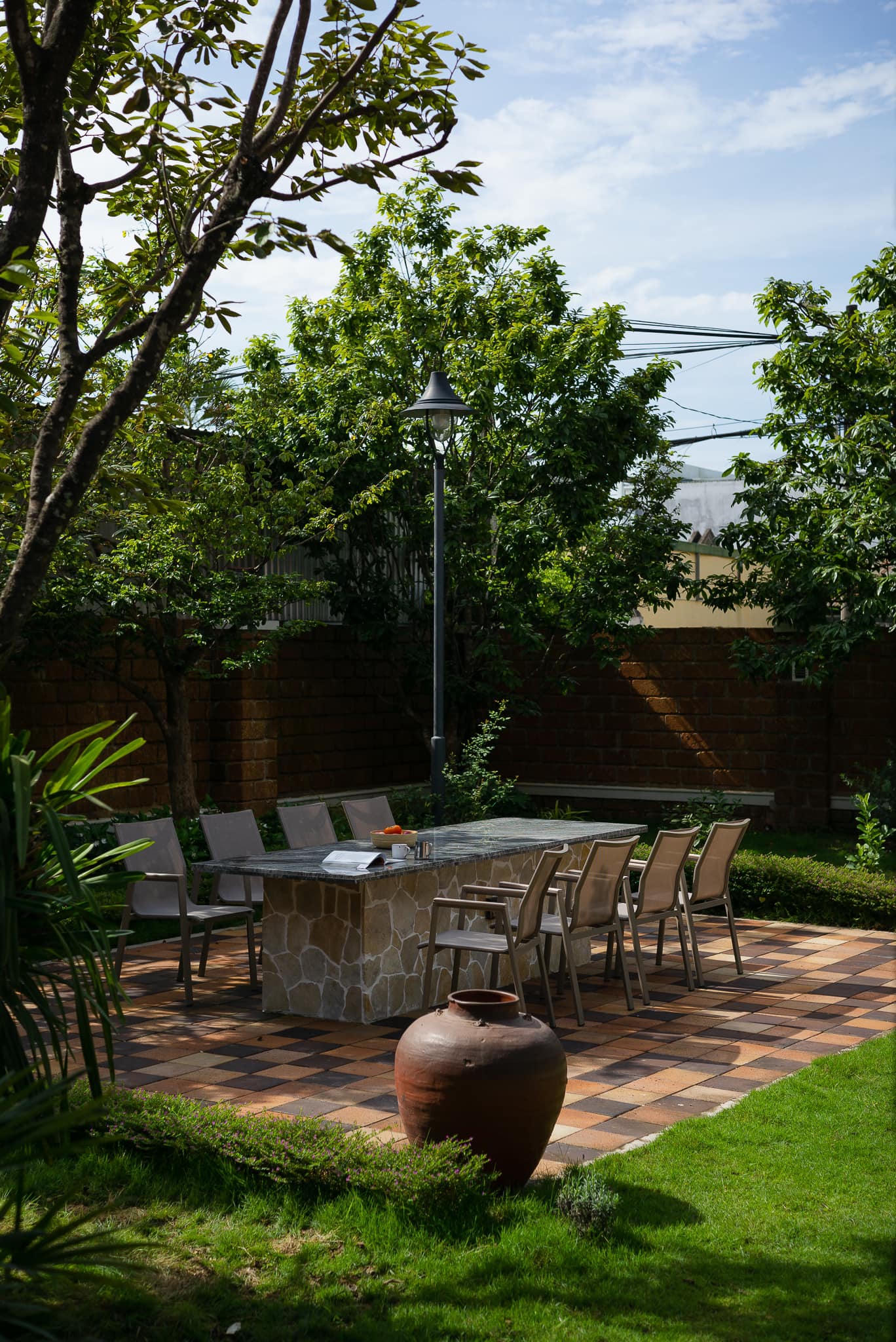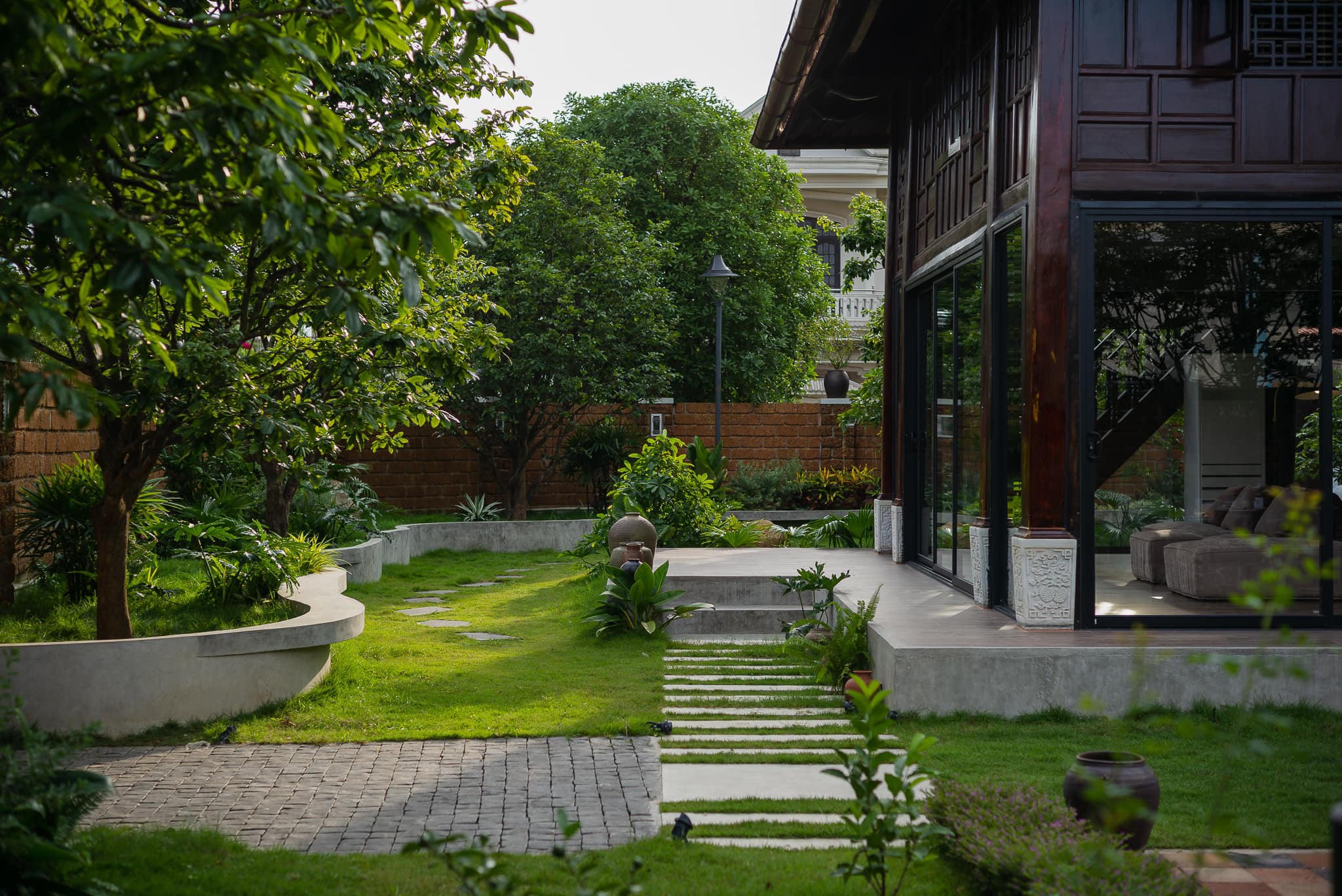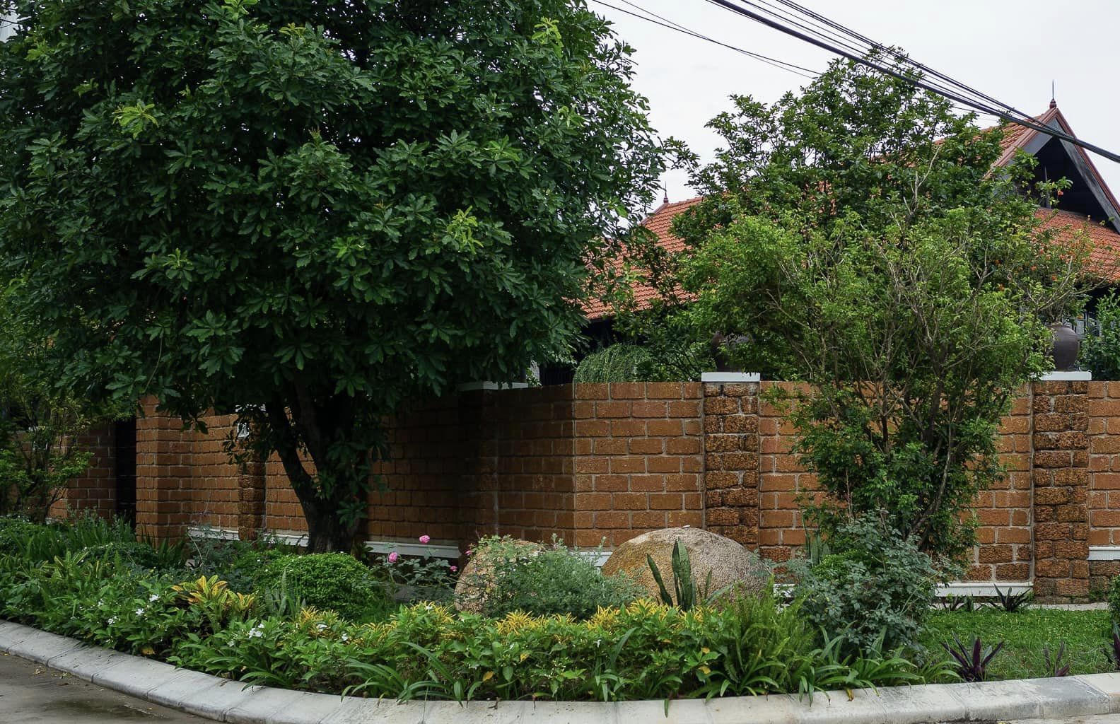 Bên cạnh đó, khu vườn rộng nhưng trước đây không được sắp đặt hợp lý dẫn đến thiếu không gian thư giãn và vui chơi cho con trẻ. Vì vậy, anh Thanh đã thiết kế lại cảnh quan với diện tích lớn khu vườn được thảm cỏ nhung Zoysia và chỉ giữ lại những cây lớn hiện trạng cùng 9 cây Mai (Cửu Mai). “Vào dịp Tết những cây Mai đua nhau nở vàng rộ các góc vườn. Phía bên ngoài tường rào bằng đá ong đỏ cũng được trồng thêm nhiều cây xanh và hoa hồng”- Anh Thanh cho hay.