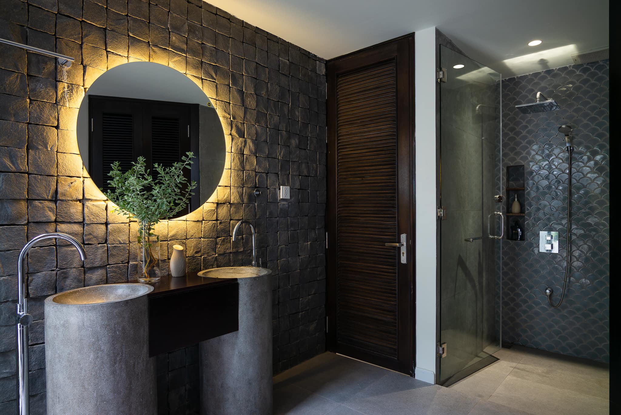 Master bathroom với điểm nhấn tường đá cubic. |