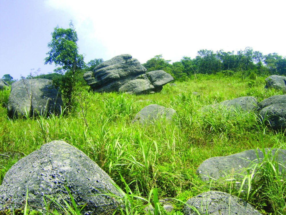 Đỉnh Sân Trời ở núi Phật Sơn hiện ra phía trước chúng tôi, trông khá lạ mắt. Trên đỉnh núi mà lại có một khu vực bằng phẳng rất rộng lớn, mà theo một người dân địa phương đi rừng cho biết đó vì rộng lớn và gần trời nên nó mới có cái tên như vậy. Một số người thuộc các dân tộc thiểu số ở đây còn gọi khu vực này bằng cái tên Lái Cỏ. Ở Sân Trời có những phiến đá lớn với nhiều hình thù kỳ quái, ngộ nghĩnh trên đồng cỏ bao la khiến mọi người vô cùng tò mò, thích thú. Có phiến đá y như hình con rùa khổng lồ. Nhiều người đã không bỏ lỡ cơ hội leo lên hòn con rùa ấy ngả lưng vài phút, rồi tự sướng kiếm lấy bức ảnh làm kỷ niệm đặc biệt… Trên đỉnh Sân Trời bát ngát mây bay, gió thổi, mọi người ai cũng cảm thấy sự khoan khoái, thú vị đang lan tỏa cơ thể mình.