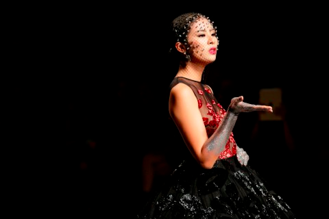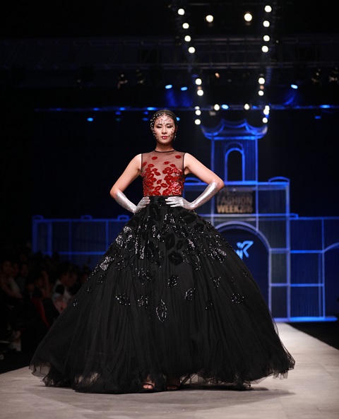 Thiết kế với phần chân rộng cùng lớp khung cứng bên trong làm Ngọc Hân di chuyển khó khăn, đôi lúc giẫm vào chân váy. Nhưng với sự bình tĩnh và kinh nghiệm lâu năm, cô vẫn hoàn thành phần catwalk suôn sẻ.