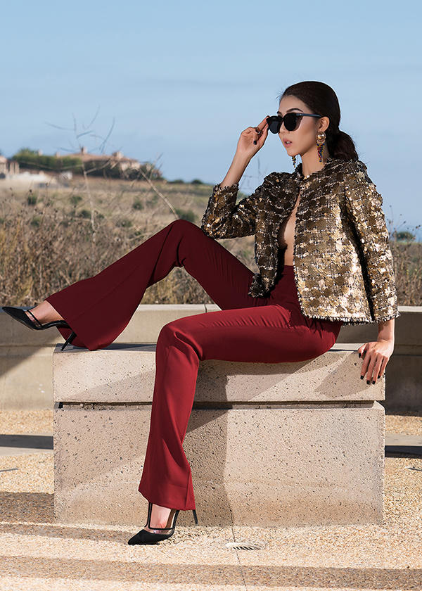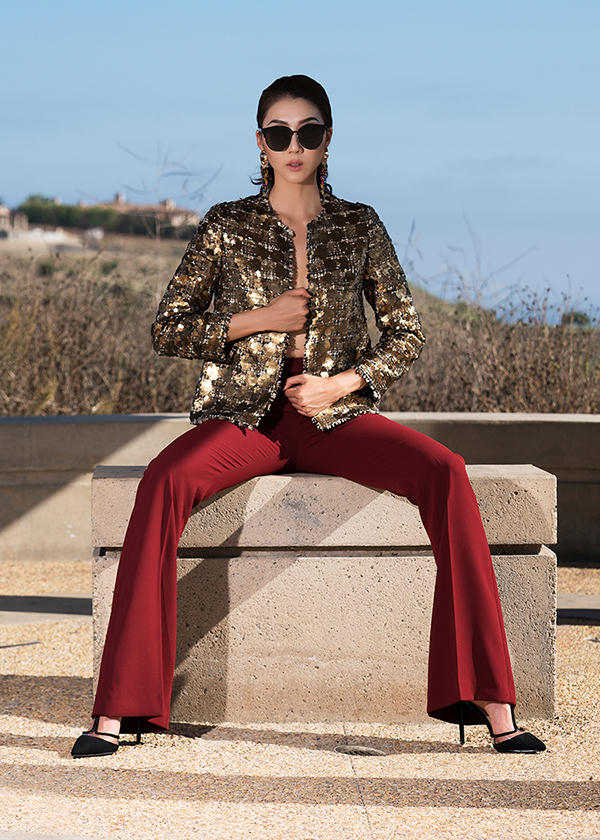 Áo khoác cổ trụ ánh kim được kết hợp cùng quần ống loe tông màu rượu chát, set đồ giúp người mặc tôn nét sexy và thể hiện đậm chất hot trend phong cách 1980.