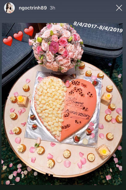 Mới đây trên Instagram, Ngọc Trinh đăng đoạn video ghi lại lễ kỷ niệm hai năm yêu của cô và bạn trai. Cô viết: "8/4/2017 - 8/4/2019. Love you".