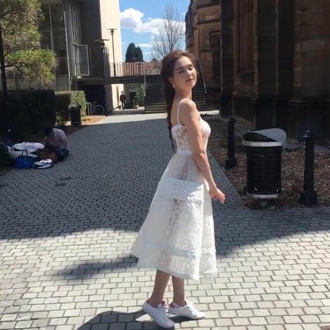 Thế nhưng sẽ không có gì đáng nói nếu như cô nàng "vòng eo 56" không có những hành động lạ giữa chốn đông người. Trong lúc Ngọc Trinh cùng ê kíp tranh thủ thời gian thực hiện bộ hình tại Úc trong thời gian tham dự Vietnam Film Festival 2016. Cô diện chiếc váy trắng xuyên thấu và không hiểu vì lý do gì, Ngọc Trinh đã phải ôm ngực cũng như đi giầy bệt thể thao chụp hình. Trông cô khá kỳ quặc giữa dòng người đang đi tại Úc.