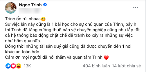 Sự việc Ngọc Trinh bị mất cả chục tỷ đồng trong biệt thự ở quận 9 đã gây sự chú ý của khán giả. Sau hơn 1 ngày xảy ra sự việc, cảm kích trước sự lo lắng của khán giả dành cho mình, cô gửi lời cảm ơn và tiết lộ tình hình ổn định.