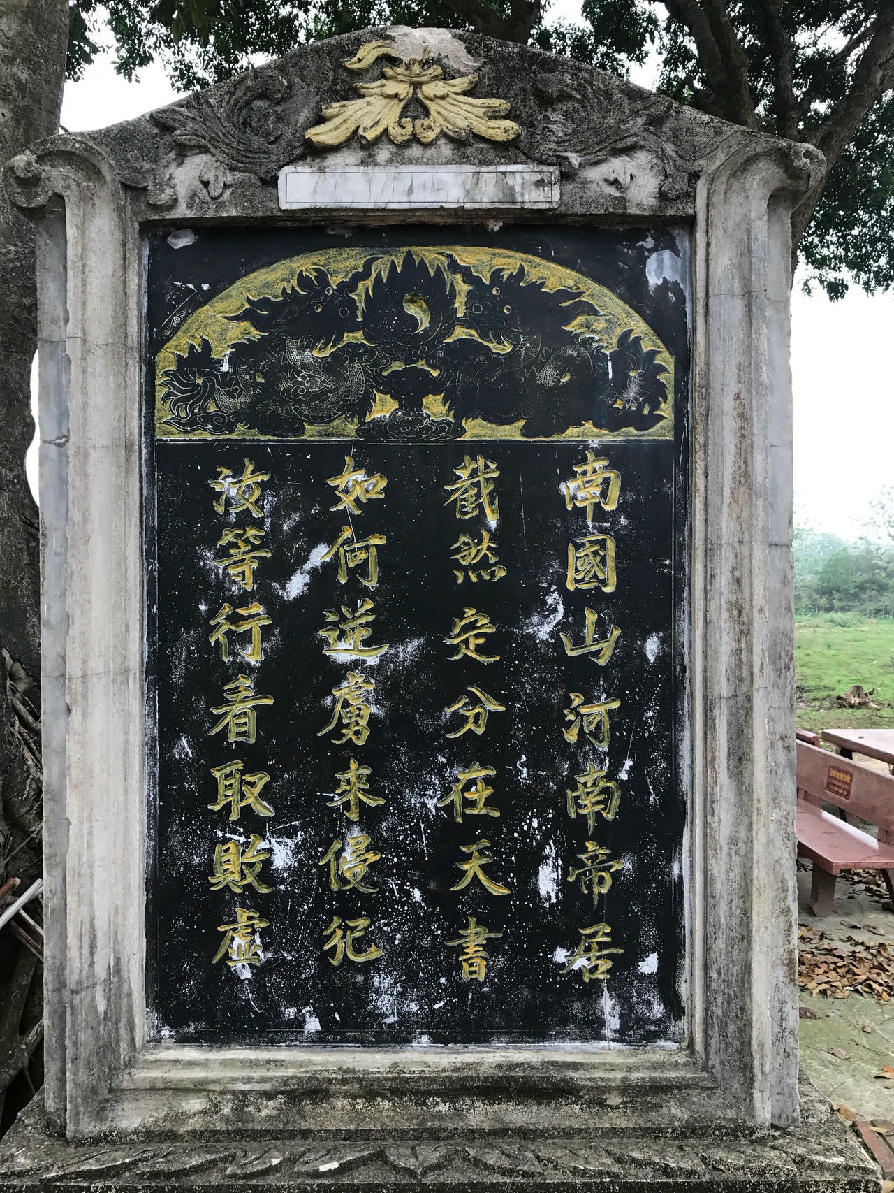 Cùng lúc đó trên không trung hay trong tâm tưởng Lý Thường Kiệt bỗng vang vọng bài thơ “Nam quốc sơn hà”: Nam quốc sơn hà Nam đế cư/ Tiệt nhiên định phận tại thiên thư/ Như hà nghịch lỗ lai xâm phạm/ Nhữ đẳng hành khan thủ bại hư” (Bản dịch: Sông núi nước Nam vua Nam ở/ Rành rành định phận ở sách trời/ Cớ sao lũ giặc sang xâm phạm/ Chúng bay sẽ bị đánh tơi bời.”