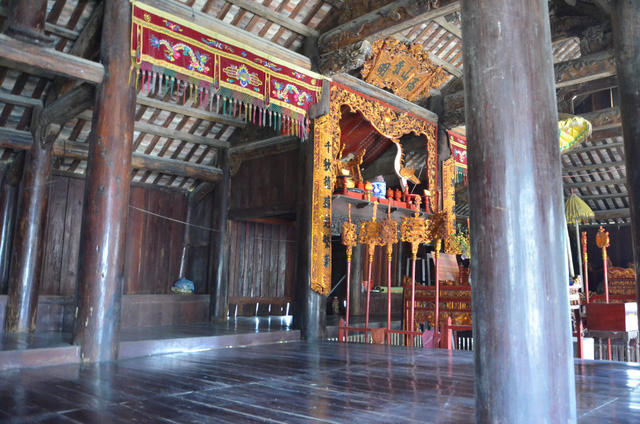 Khi ngước lên trần gian chính điện, du khách có thể thưởng thức họa tiết lưỡng long chầu nguyệt. Phần mái khám thờ được chạm khắc hình tượng 4 linh vật phương Đông. Phần dưới khám thờ được đỡ bằng ván mê có chạm biểu tượng hổ phù mang ý nghĩa hóa sát trừ tà. Hai bên được khắc rồng nhả mây.