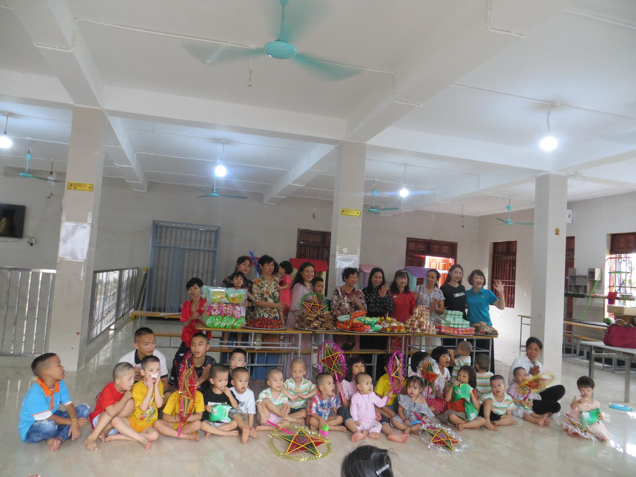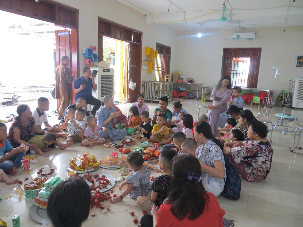 Các em bé trong "Ngôi nhà chung" cùng vui Trung Thu cùng với đoàn du khách tham quan và tham gia thiện nguyện trong chùa. |