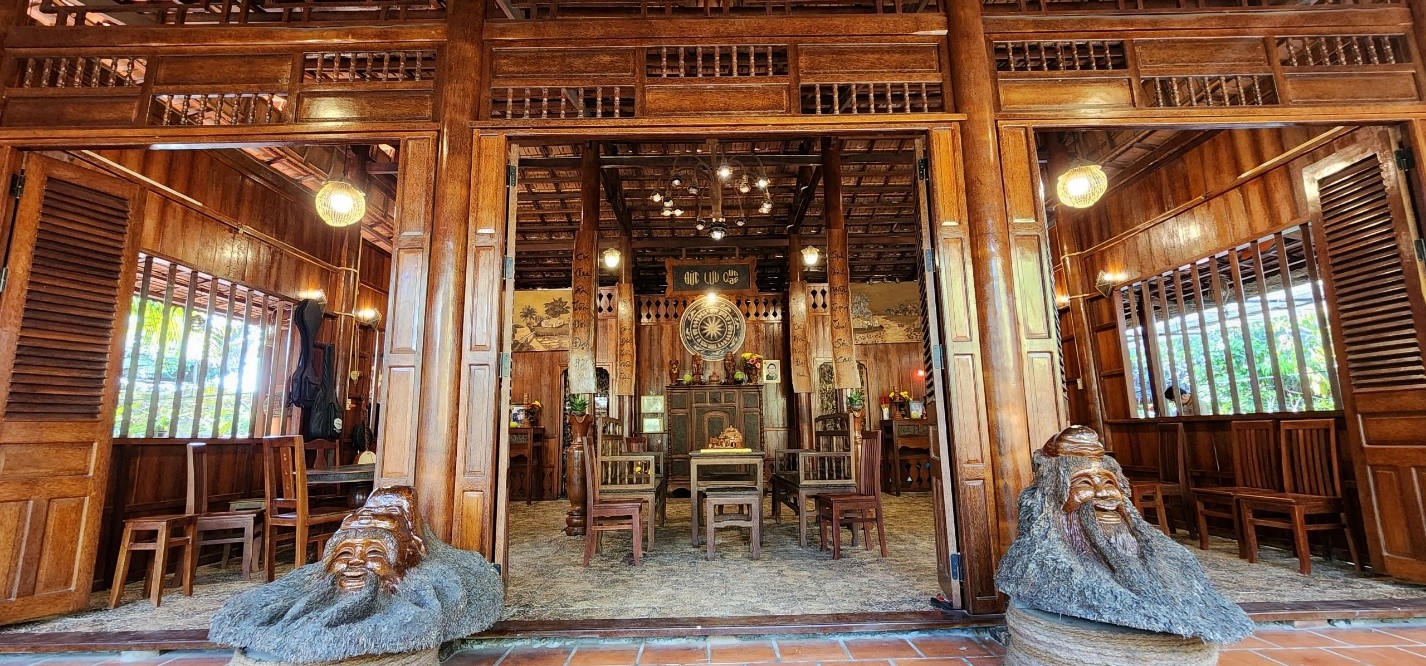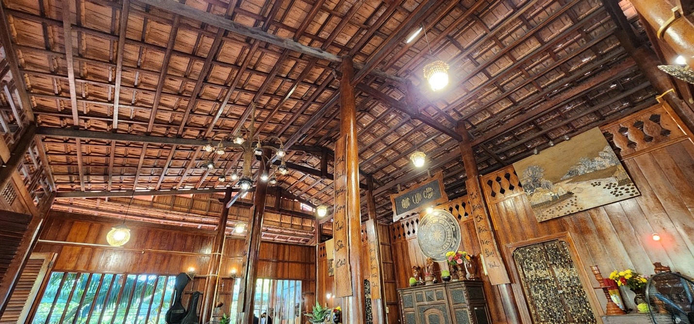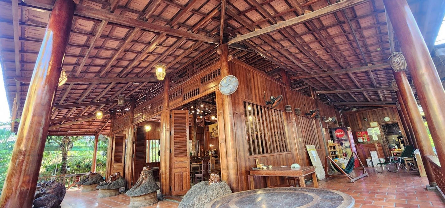Trong khuôn viên rộng gần 8.000m2, ngôi nhà dừa được xây dựng vị trí trung tâm truyền thống 3 gian 2 chái, toàn bộ khuôn viên sử dụng hơn 4.000 cây dừa, có những cây cột tuổi từ 80-100 năm, kinh phí xây dựng nhà dừa và toàn bộ khuôn viên lên tới 6 tỷ đồng.