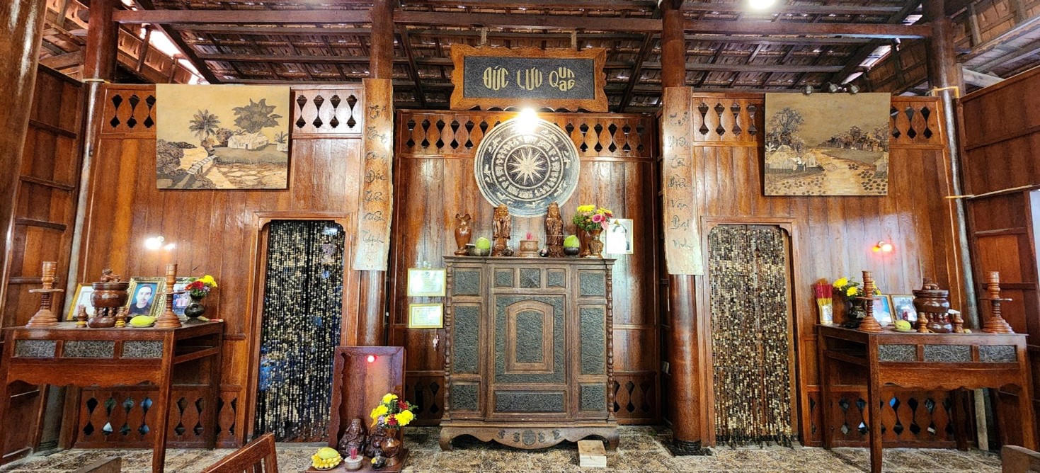 Ngôi nhà được xây dựng theo kiểu Nam Bộ truyền thống với 3 gian 2 chái. Từ kèo, cột, vách đến nội, ngoại thất, vật dụng đều làm bằng chất liệu là dừa vô cùng lạ mắt