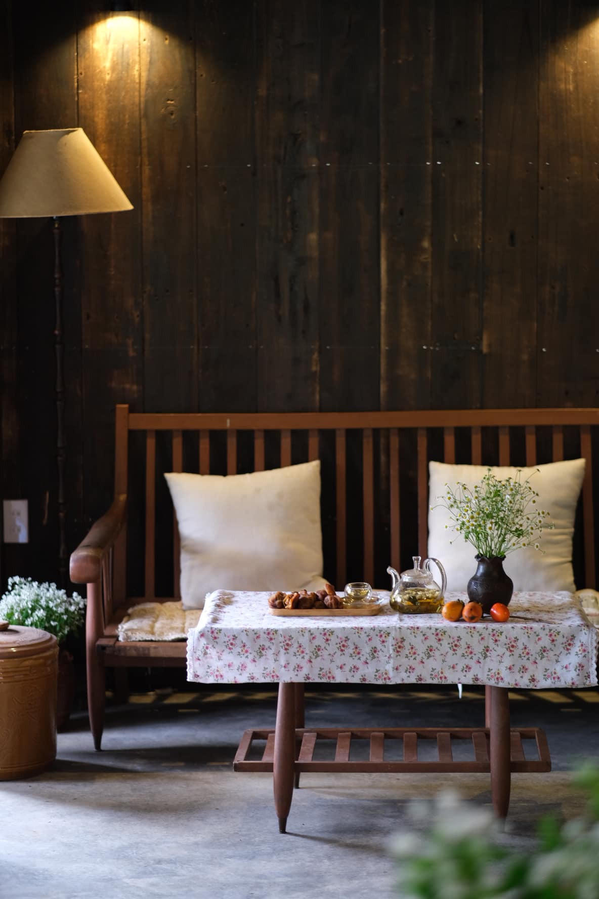 Nội thất theo phong cách xưa, có phần tối giản và hài hòa với chất liệu gỗ của nhà. Chị dùng đèn cây màu vàng, may thêm gối và khăn phủ bàn họa tiết hoa nhí để thổi vào đó chút vintage cho không gian sống thêm lãng mạn.