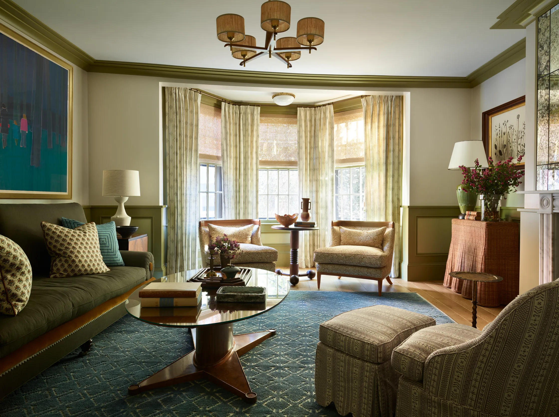 Màu xanh lá là tông màu chủ đạo trong căn nhà này, tạo nên sự trang nhã và thanh lịch. Các điểm nhấn hiện đại như ghế kiểu Scandinavia và tấm thảm Thụy Điển cũng mang đến sự tinh tế cho không gian tổng thể.