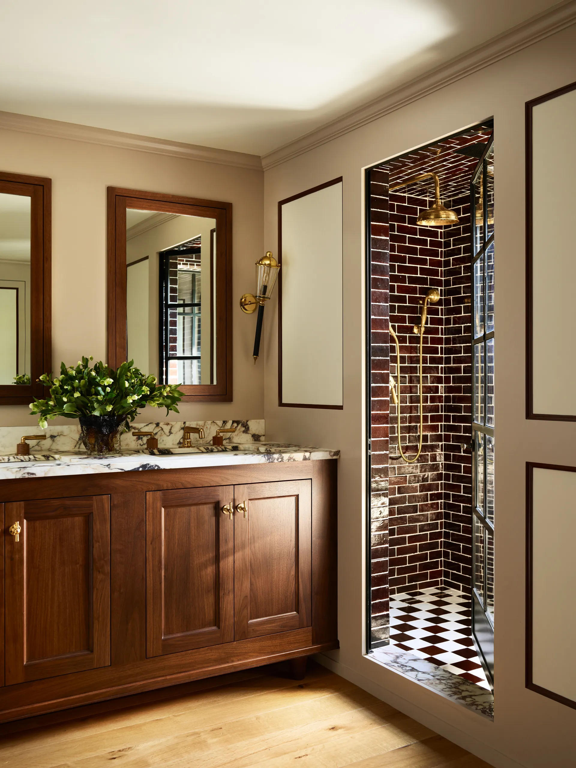 Phòng tắm sử dụng nhiều hoạ tiết khối (Ảnh: Architectural Digest). |