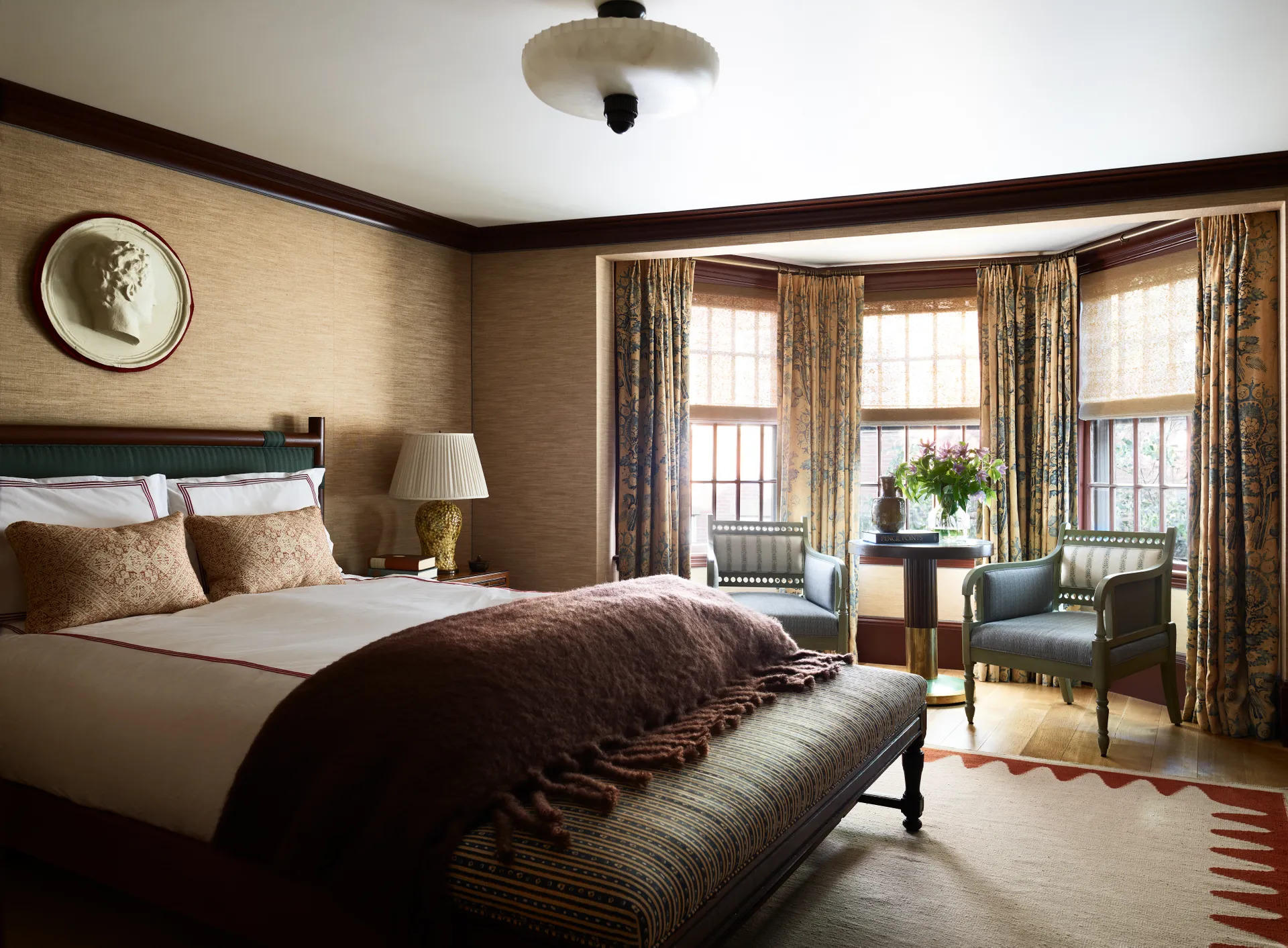 Phòng ngủ với gam màu trầm ấm (Ảnh: Architectural Digest). |