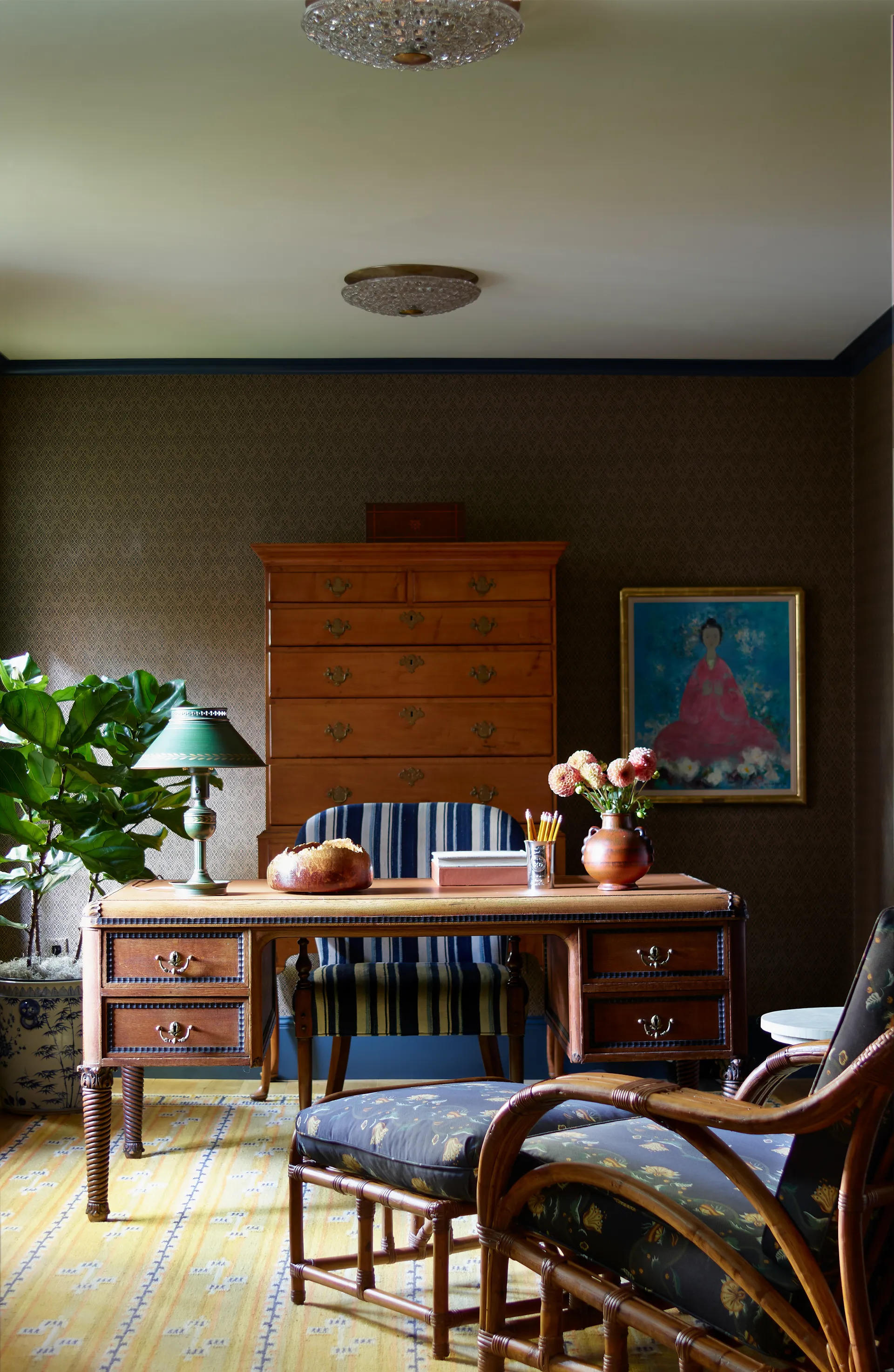 Phòng làm việc mang đến sự ấm cúng với kết hợp màu vàng và xanh. Bàn làm việc cổ điển kết hợp với ghế sọc xanh tạo nên sự hài hòa.