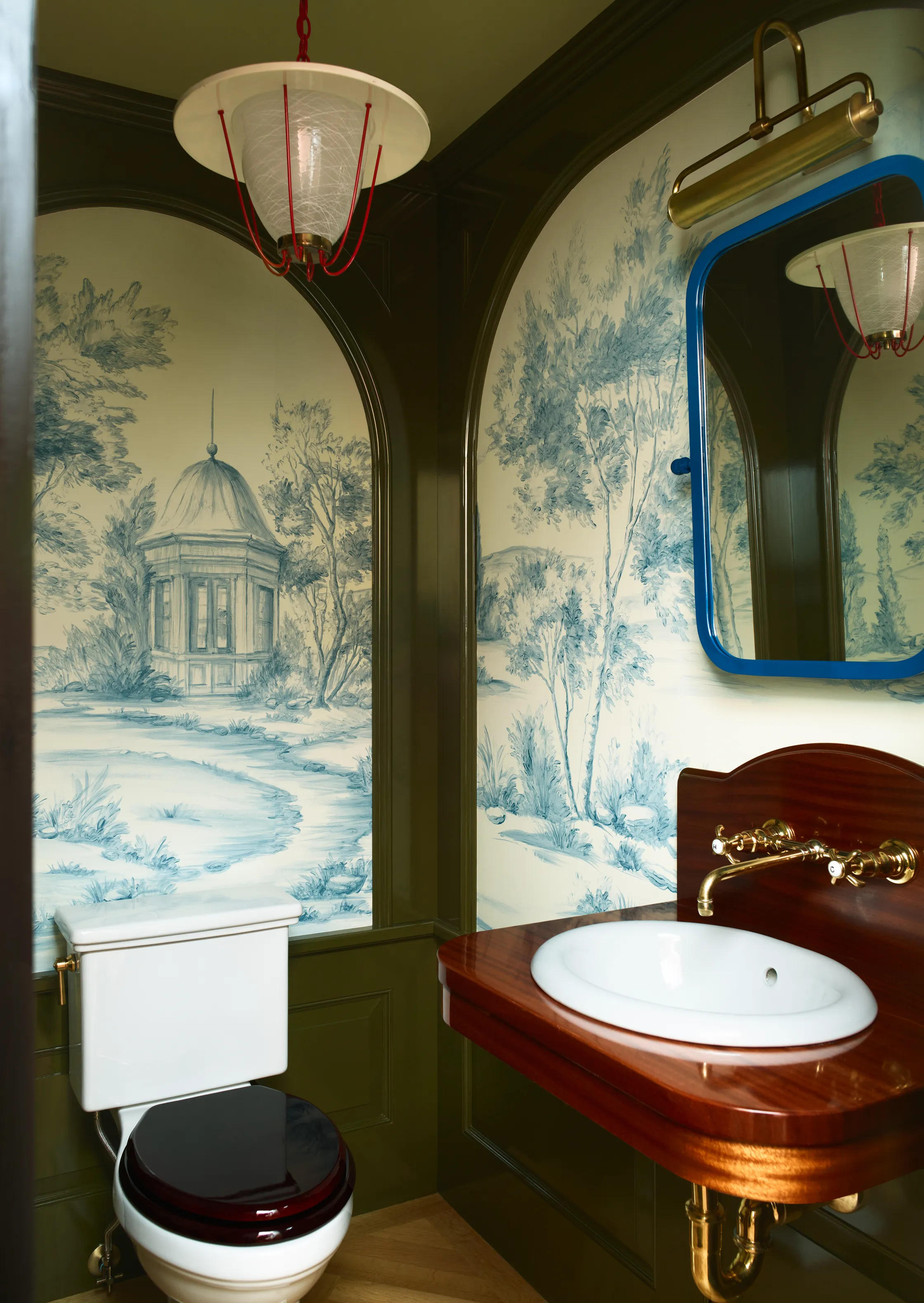 Nhà vệ sinh với bức tranh 2 màu xanh, trắng (Ảnh: Architectural Digest) |