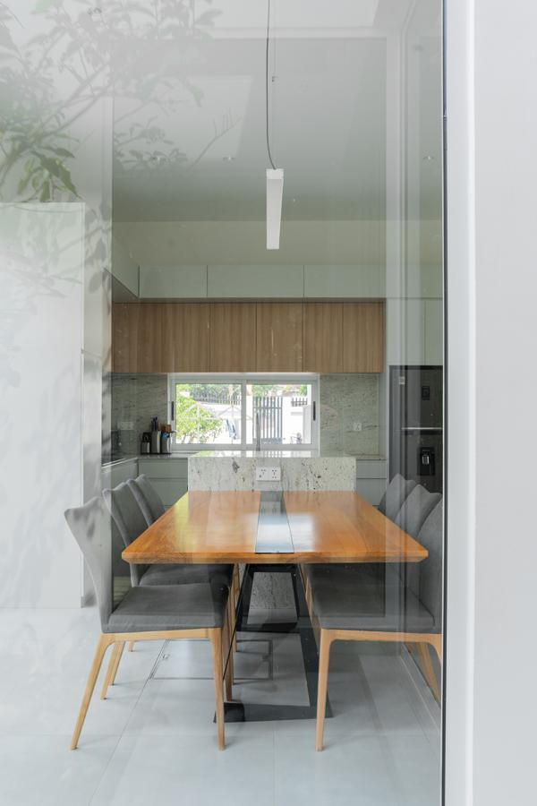 Phòng bếp và khu vực ăn chiếm diện tích vừa đủ nhưng được bố trí rất gọn gàng và ngăn nắp, đầy đủ khu vực tủ bếp và đảo bếp tiện lợi. Từ khu vực này có thể nhìn ra cảnh quan sân vườn với những ô cửa kính lớn, cực kì thông thoáng và thoải mái.