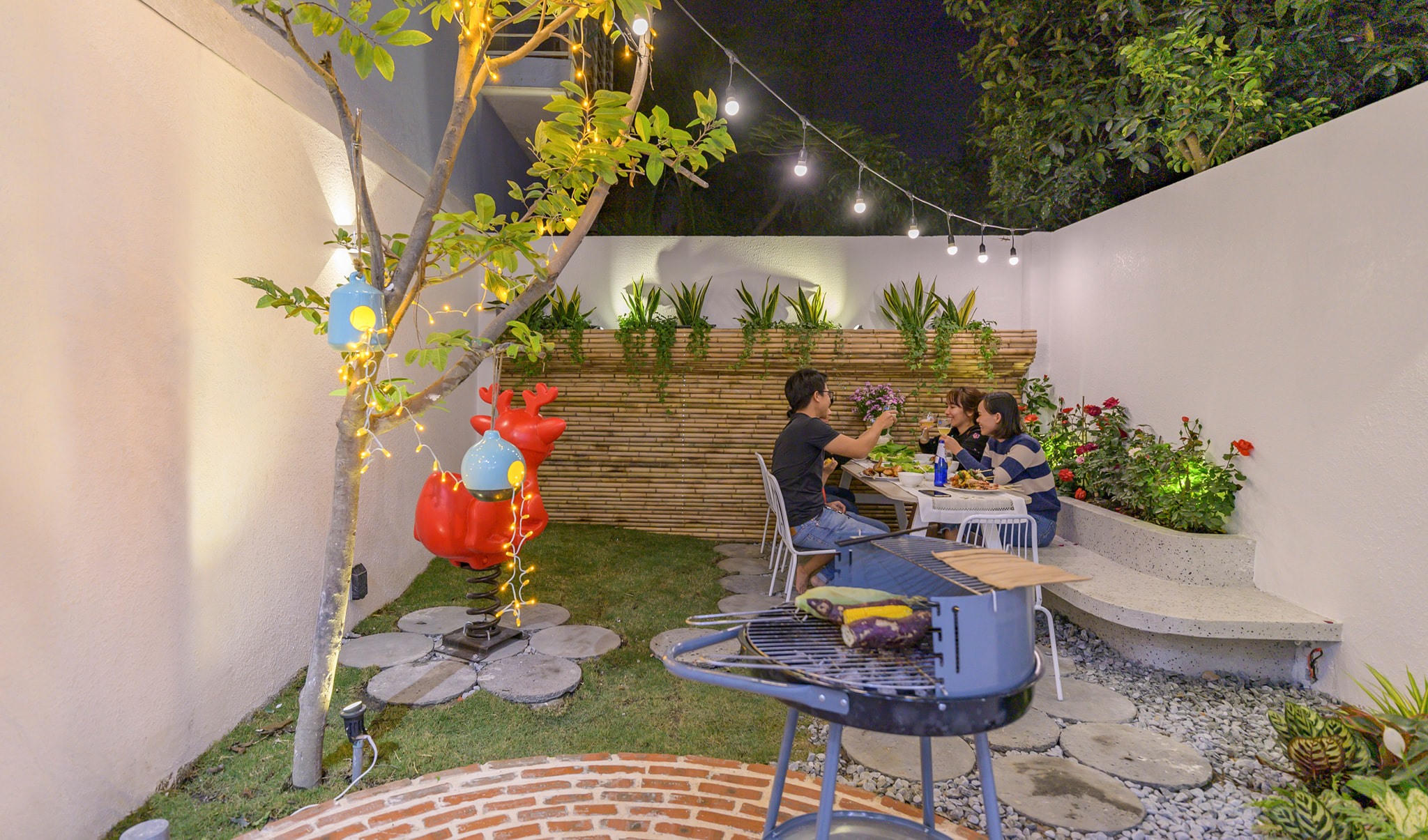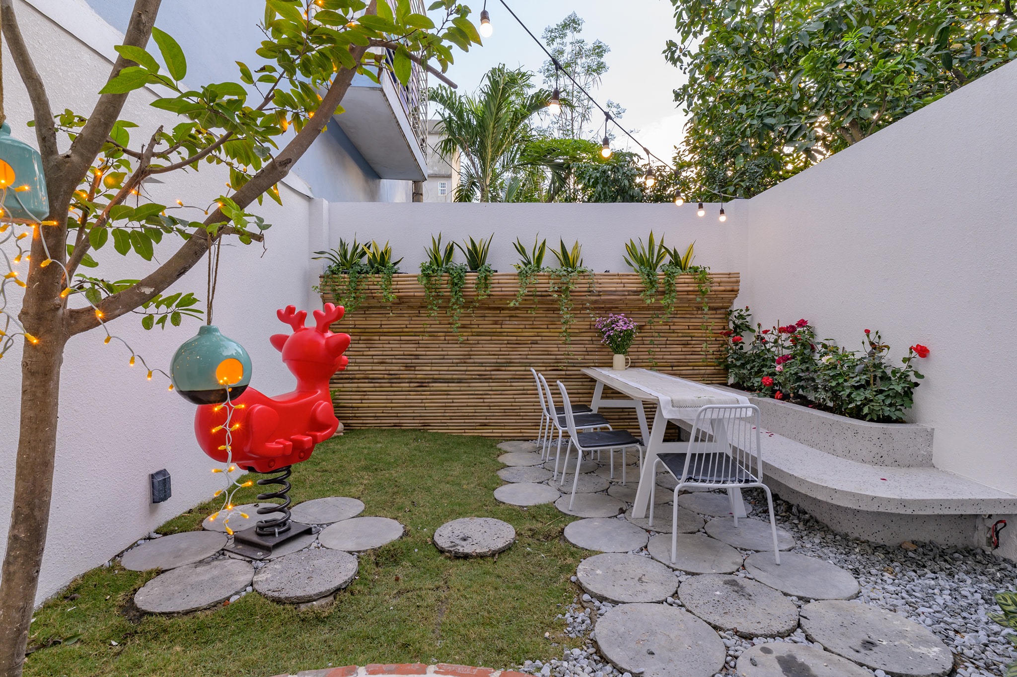 Sân vườn rộng rãi ngay tầng 1, được tận dụng tối đa khoảng diện tích vừa trồng hoa, vừa có góc vui chơi cho trẻ em và bàn ăn uống. |