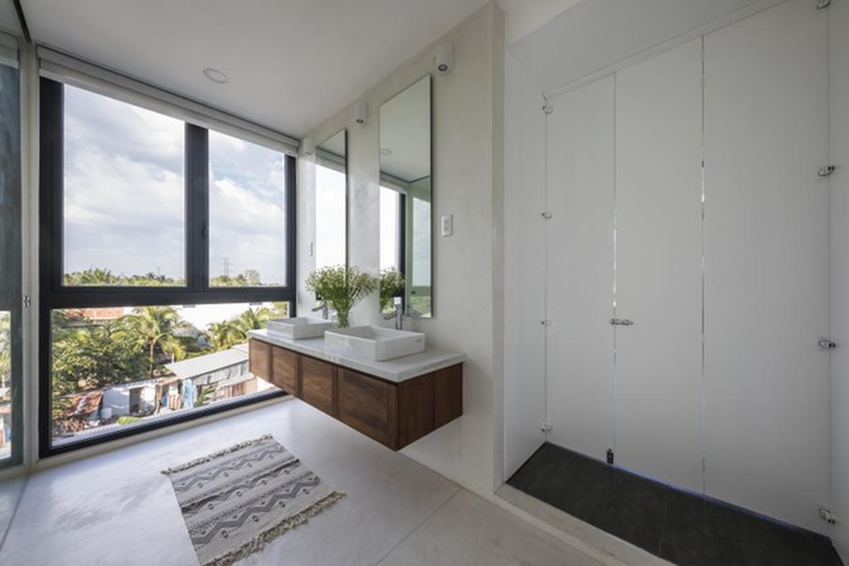 Phòng tắm được thiết kế đơn giản với tông màu trắng (Ảnh: MM architects / Mimya) |